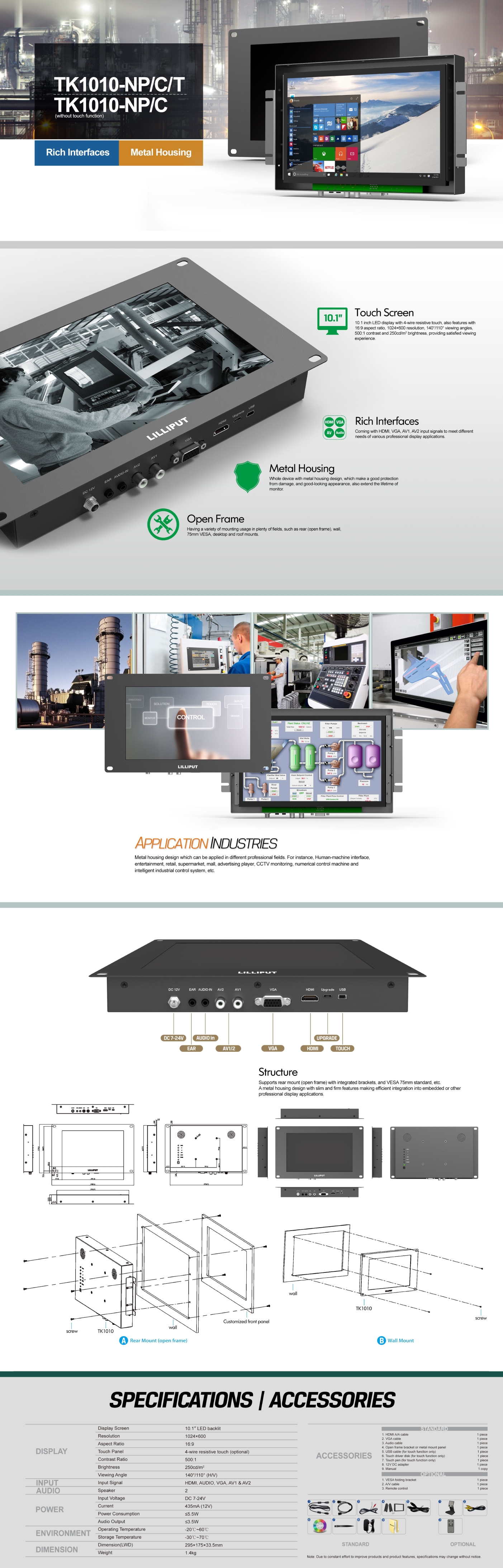 Lilliput TK1010-NP/C je 10,1-inčni monitor otvorenog okvira bez dodira, rezolucije 1024x600, svjetline 250 cd/m² i omjera slike 16:9, s HDMI, DVI, VGA i audio ulazima, smješten u izdržljivom metalnom okviru za prednju integraciju u zidove, zaslone ili prilagođena kućišta, s VESA 75 montažom i opcijama bočne montaže za svestranu instalaciju.