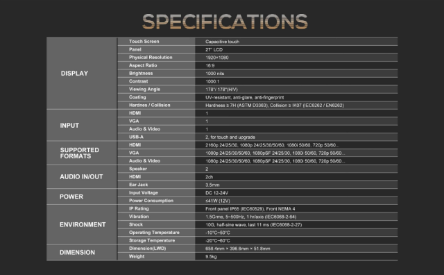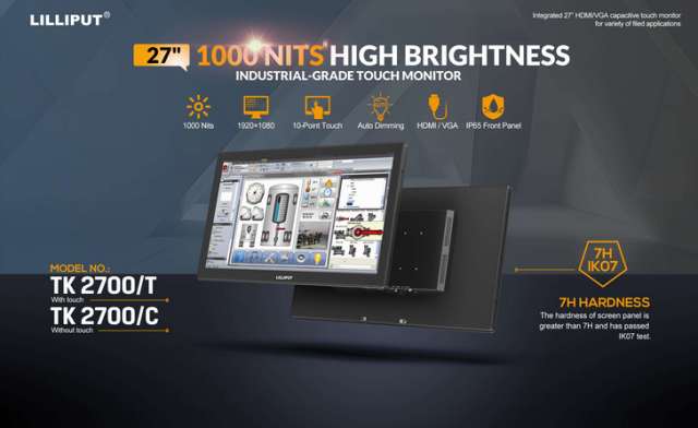 Lilliput TK2700-NP/C je 27-inčni metalni monitor - najveći u TK seriji monitora s metalnim okvirom - opremljen kapacitivnim zaslonom osjetljivim na dodir s 10 točaka i zaslonom visoke svjetline od 1000 nita. Izbor ulaza uključuje HDMI, VGA i - za video prijenose starijeg stila - također podržava RCA / kompozitni ulaz. Ploča je proizvedena posebno za ovaj model monitora i ima premaz protiv odsjaja, tretman protiv otisaka prstiju kako bi se spriječilo zasjenjenje od dodirivanja monitora i UV otpornost za jasno gledanje na otvorenom. Fizičke karakteristike uređaja su impresivne i dizajniran je za korištenje u javnosti, podržava dodir s rukavicama, prednju ploču otpornu na vodu/prašinu IP65/NEMA 4, ocjenu tvrdoće 7H i ocjenu otpornosti na udarce IK07, što ga čini čvrstim i robusnim monitorom.