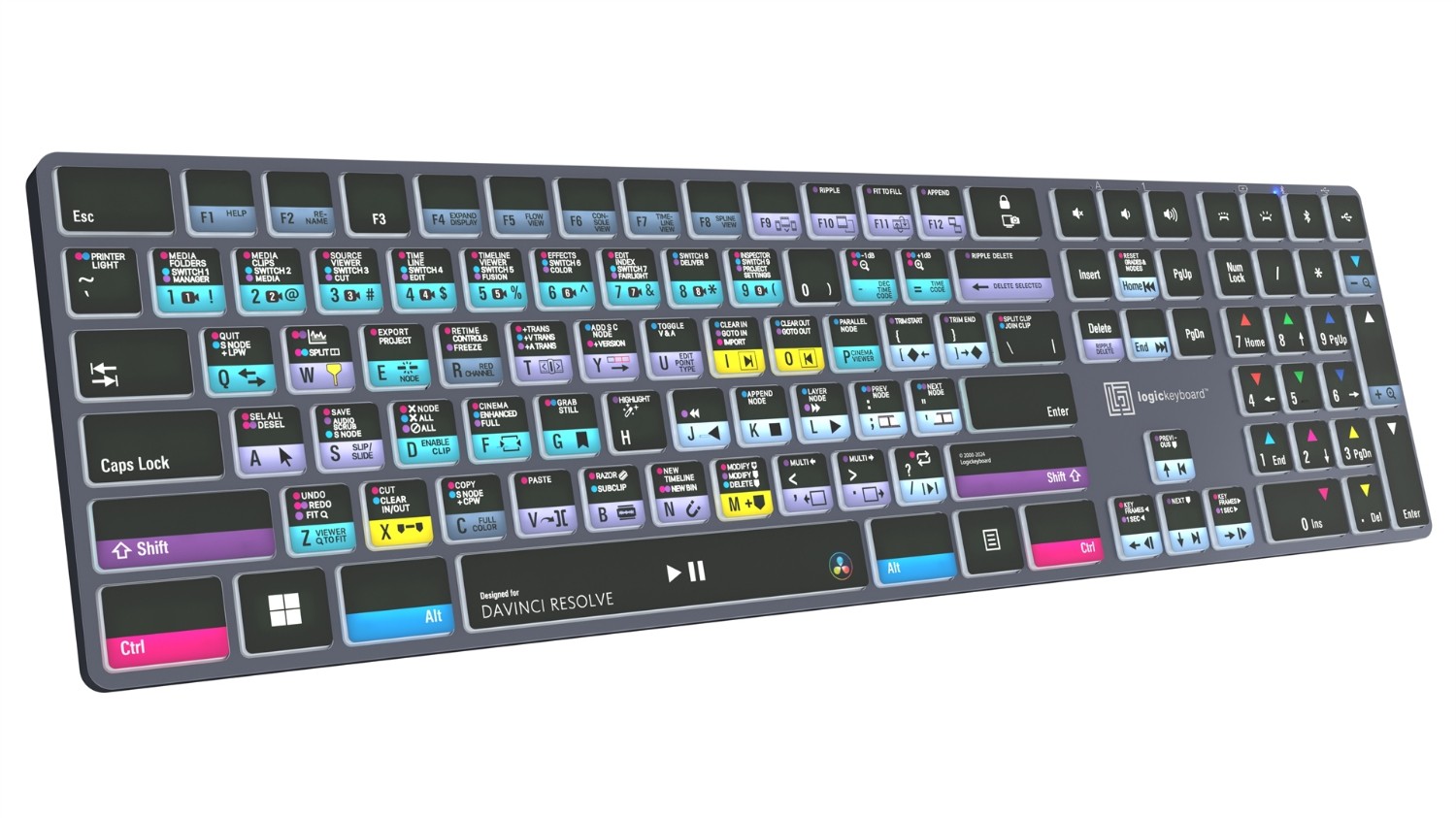 Ova Logic tipkovnica je vaš prvi izbor prilikom uređivanja u DaVinci Resolveu. Prečaci naredbi označeni na tipkama i njihove definicije u bojama čine vas majstorom upravljanja DaVinci Resolveom u tren oka. Logic tipkovnica je idealna za postprodukcijske centre, profesionalne montažne kuće i sve ostale koji marljivo rade s DaVinci Resolveom.