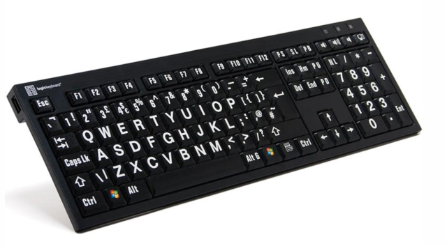 Logickeyboard XLPrint NERO White on Black PC tipkovnica s velikim slovima i visokim kontrastom dizajnirana je za korisnike s oštećenjem vida, kombinirajući pristupačnost s profesionalnom funkcionalnošću. S taktilnim tipkama na škarice, ugrađenim USB hubovima i priloženom LogiLight LED lampom, pruža udobnost, praktičnost i produktivnost u svakom okruženju.