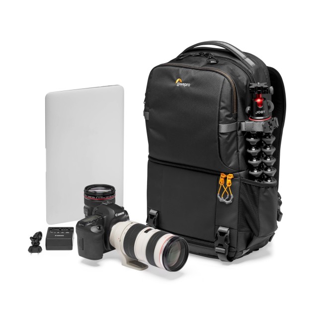 Sivi Lowepro Fastpack BP 250 AW III je svestran ruksak s dva glavna odjeljka, uključujući odjeljak za fotoaparat na dnu ruksaka koji može primiti DSLR ili bezzrcalni fotoaparat s četiri do pet objektiva, uključujući i montirani objektiv.