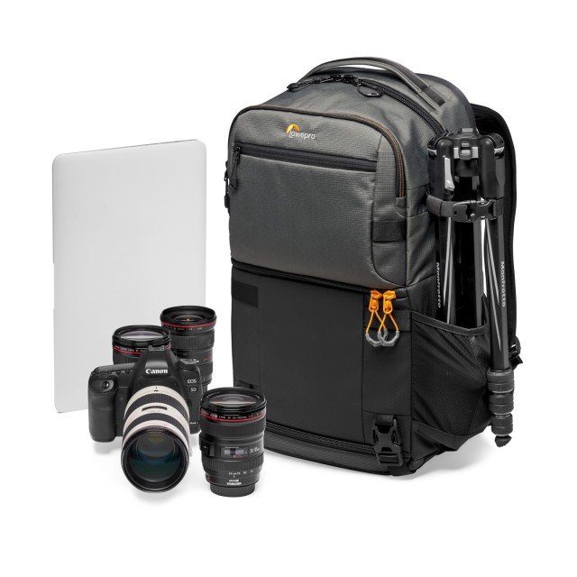Sivi Lowepro Fastpack Pro BP 250 AW III je svestran ruksak s dva glavna pretinca, uključujući pretinac za fotoaparat na dnu ruksaka koji može primiti DSLR ili bezzrcalni fotoaparat s četiri do pet objektiva, uključujući pričvršćeni objektiv.