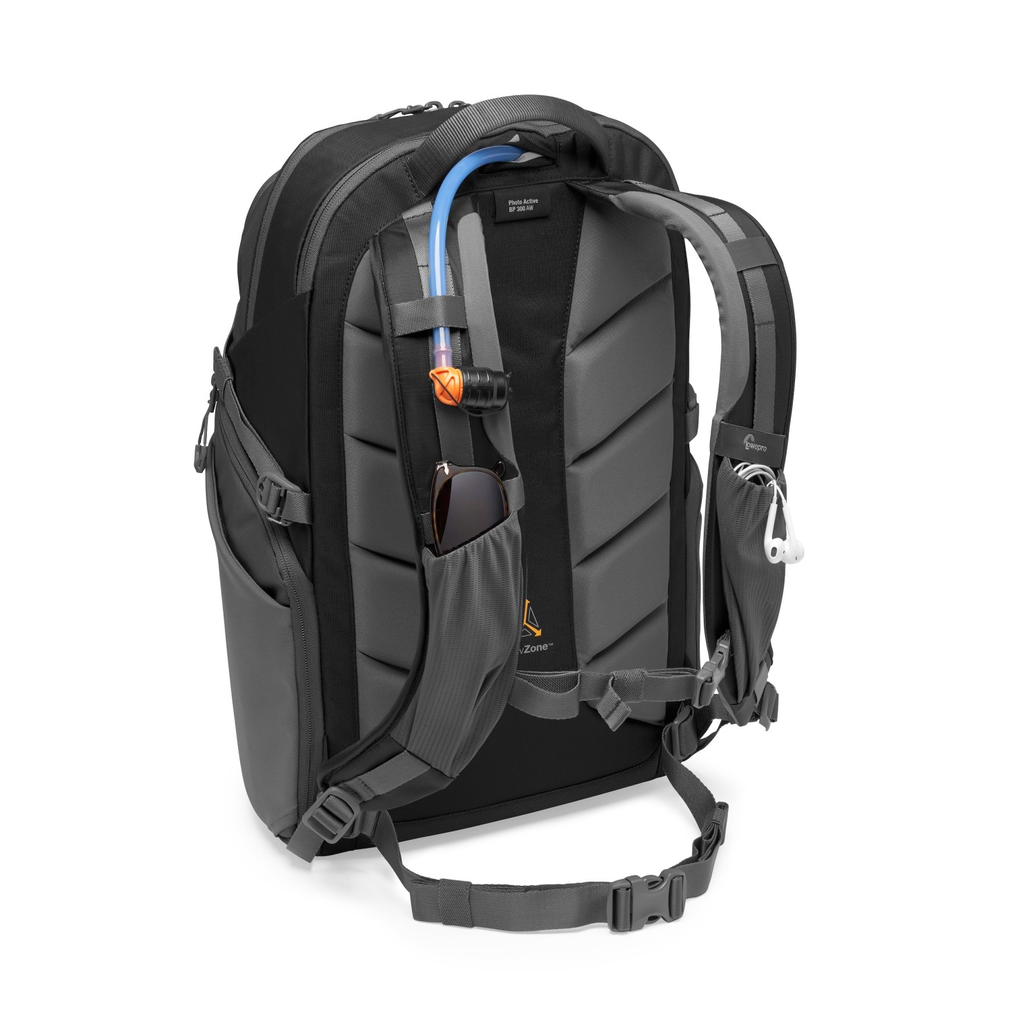 Bočni poklopci s patentnim zatvaračem otvaraju se od tijela, a njihove unutarnje strane sadrže džepove za memorijske kartice, dodatnu opremu i organizator za sitnice. Na vanjskoj strani ruksaka nalazi se podstavljeni gornji džep, bočni mrežasti džepovi za bocu ili, primjerice, stativ te prednji džep za dodatnu opremu.
