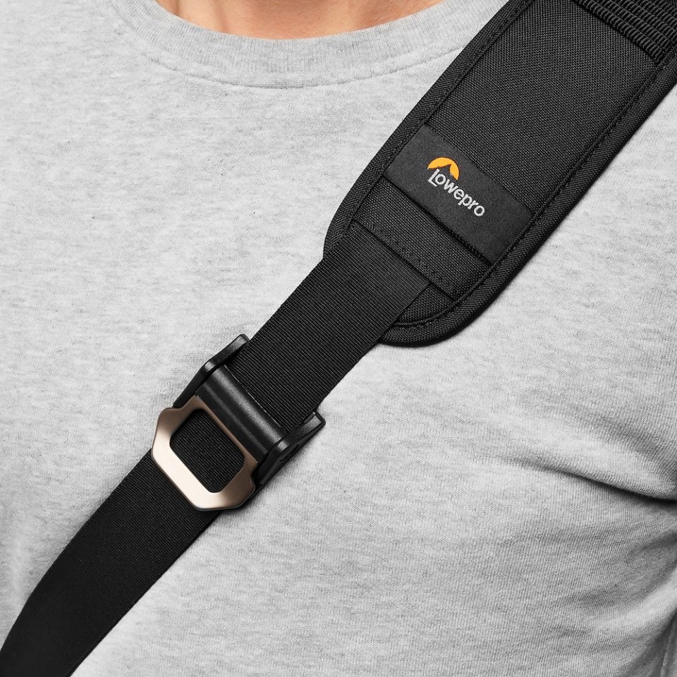 Postoji točka za montažu kompaktnog stativa i modularne vanjske dodatke. Trake su jednostavno podesive: visoko na ramenima za brže kretanje, s remenom preko prsa za udobnost i stabilnost ili nisko na bokovima za lakšu promjenu objektiva.