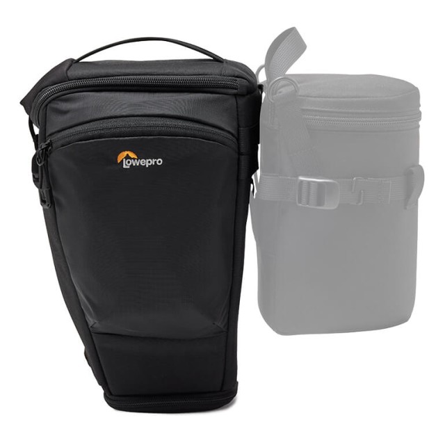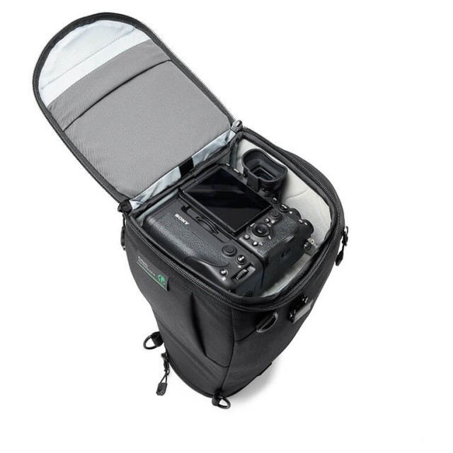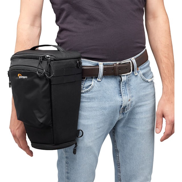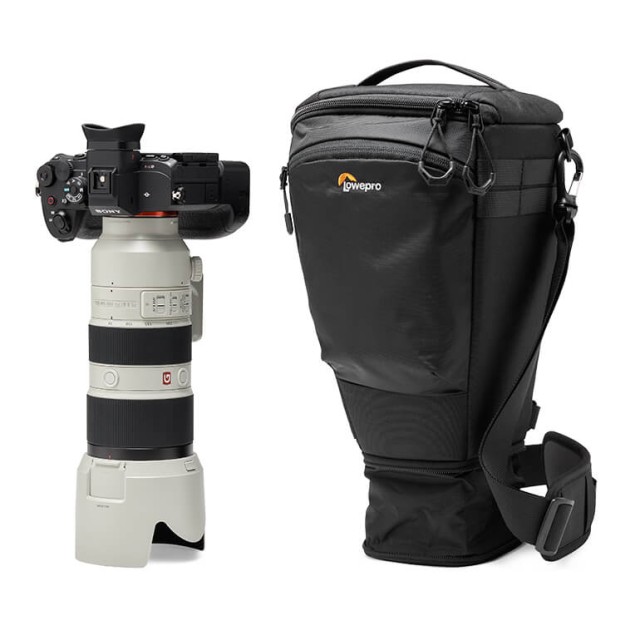 TopLoader odgovara kućištu punog okvira s rukohvatom i objektivom do 70-200 mm F2.8, s proširenjem za sjenilo objektiva. Kompatibilan s dodacima SlipLock kao što su kutije za leće