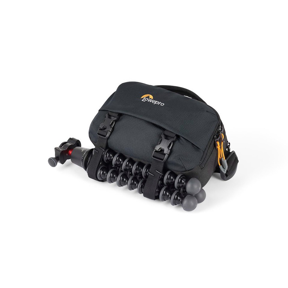 Crni Lowepro Trekker Lite HP 100 Hip Pack može držati mali fotoaparat s crop senzorom, poput Sony Alpha 6400 ili sličan fotoaparat bez tražila, ali s dva mala objektiva, ili kompaktni fotoaparat i akcijsku kameru.