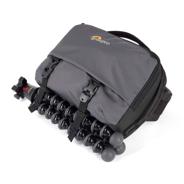 Postoji mali prednji džep s patentnim zatvaračem za vaše ključeve, telefon ili druge sitnice; a glavni patentni zatvarač omogućuje vam pristup pretincu za fotoaparat. Par traka omogućuje pričvršćivanje stolnog stativa ili jakne na donju prednju ploču. S unutarnje strane torbe pronaći ćete dodatni držač za bocu s vodom koji se može koristiti s remenima.