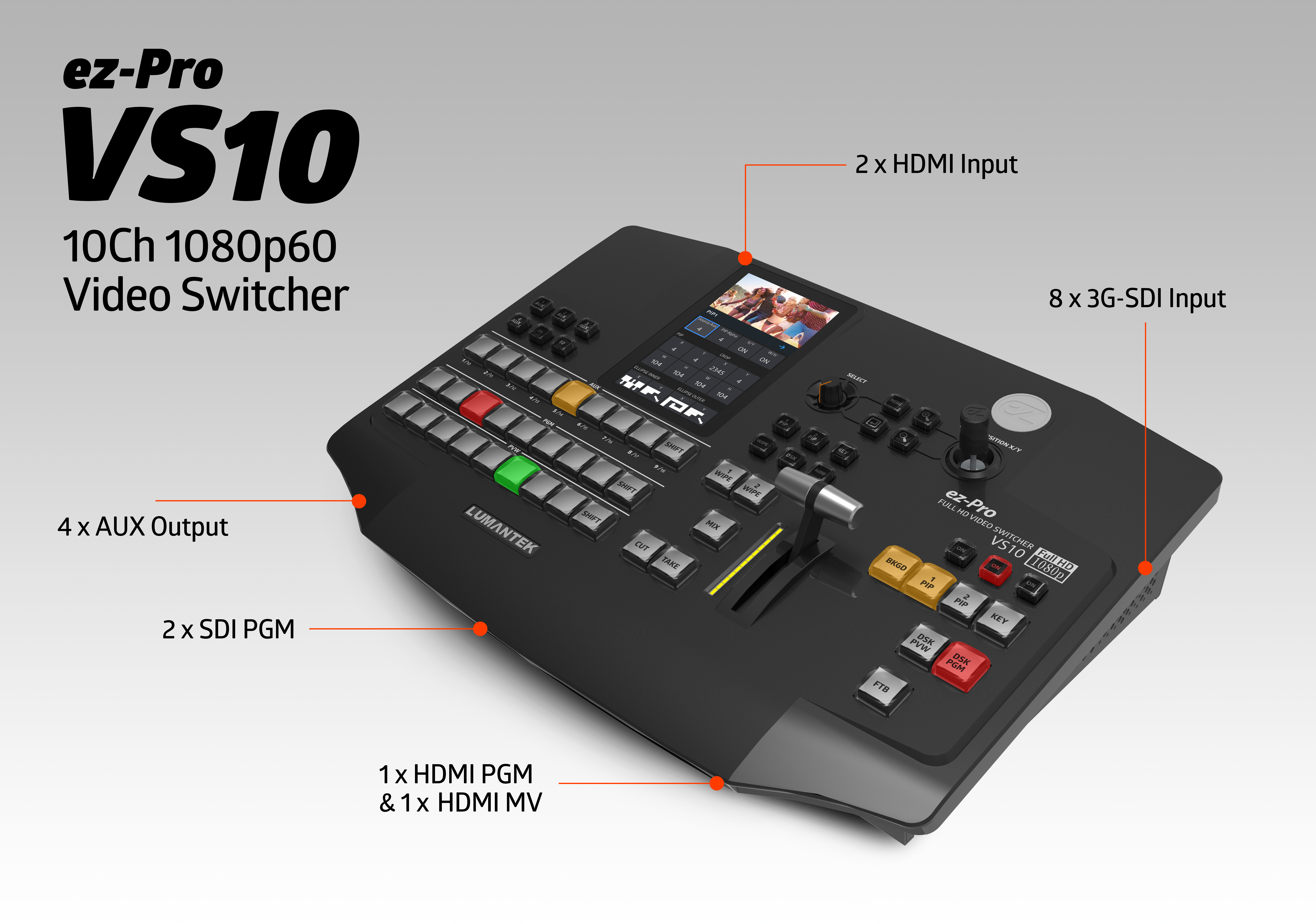Opet, LUMANTEK vam daje još jedan switcher dobar za događaje uživo, ali s više priključaka nego prije. Više zaslona za praćenje u jednom preklopniku s većim dodirnim zaslonom za upravljanje.