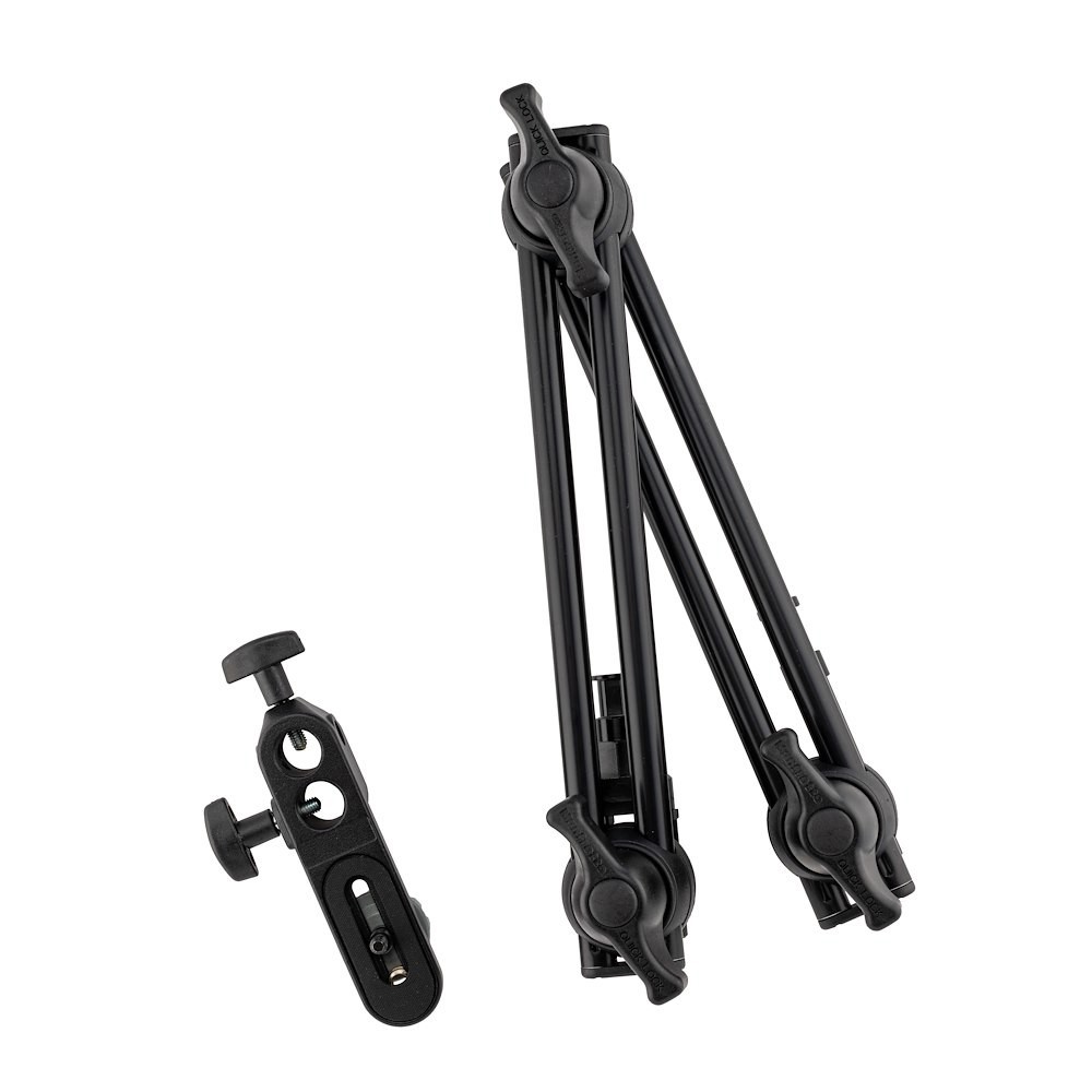 Manfrotto 396B-2 ima dva zglobna dijela s kliznim nastavkom koji se trenutno zaključava pomoću ergonomskih poluga za brzo otpuštanje, dosežući 62,5 cm za precizne postavke iznad glave, sa strane ili pod niskim kutom. Gornji nosač kamere uključuje ženski navoj 3/8"-16 i mali klin od 16 mm, dok donji nastavak kombinira šesterokutni profil protiv rotacije (kompatibilan sa Super Clampom) s univerzalnim okruglim presjekom od 16 mm za stalke ili stezaljke. Crni anodizirani aluminijski okvir, ocijenjen za 5 kg, otporan je na savijanje i habanje, što ga čini idealnim za fotografiranje proizvoda, video nadzor ili rad s LED panelima, blicevima ili malim kamerama - kompaktan, snažan i beskrajno podesiv.