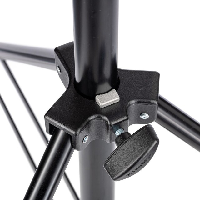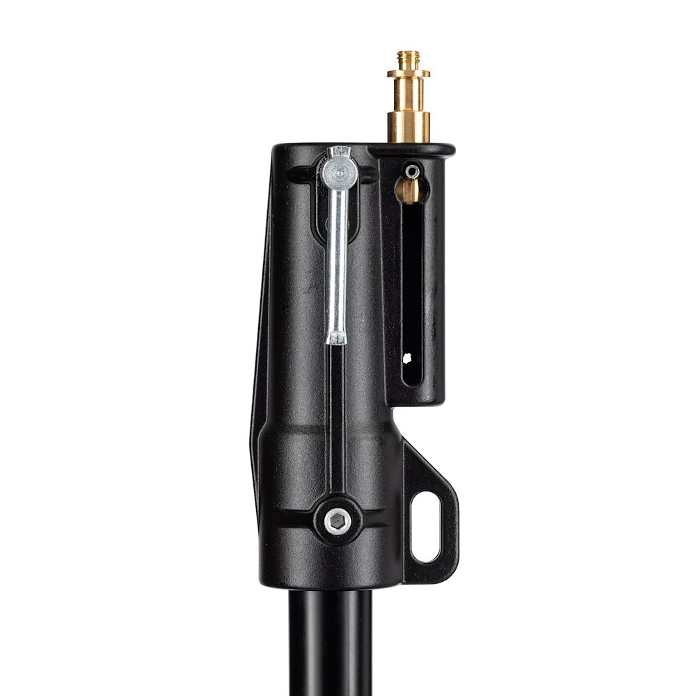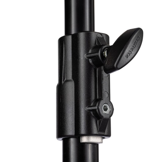 Uključuje nogu za niveliranje koja omogućuje stabilnu upotrebu na neravnim površinama, uključujući stepenice ili kosine. Stalak podržava maksimalnu nosivost od 15 kg i proteže se do 212 cm, sa zatvorenom duljinom od 112 cm za jednostavno skladištenje i transport. Njegove dvostruke mogućnosti gornjeg pričvršćivanja - ženski prijemnik od 28 mm (1 1/8") i muški klin od 16 mm (5/8") - osiguravaju kompatibilnost sa širokim rasponom rasvjetnih tijela i pribora.