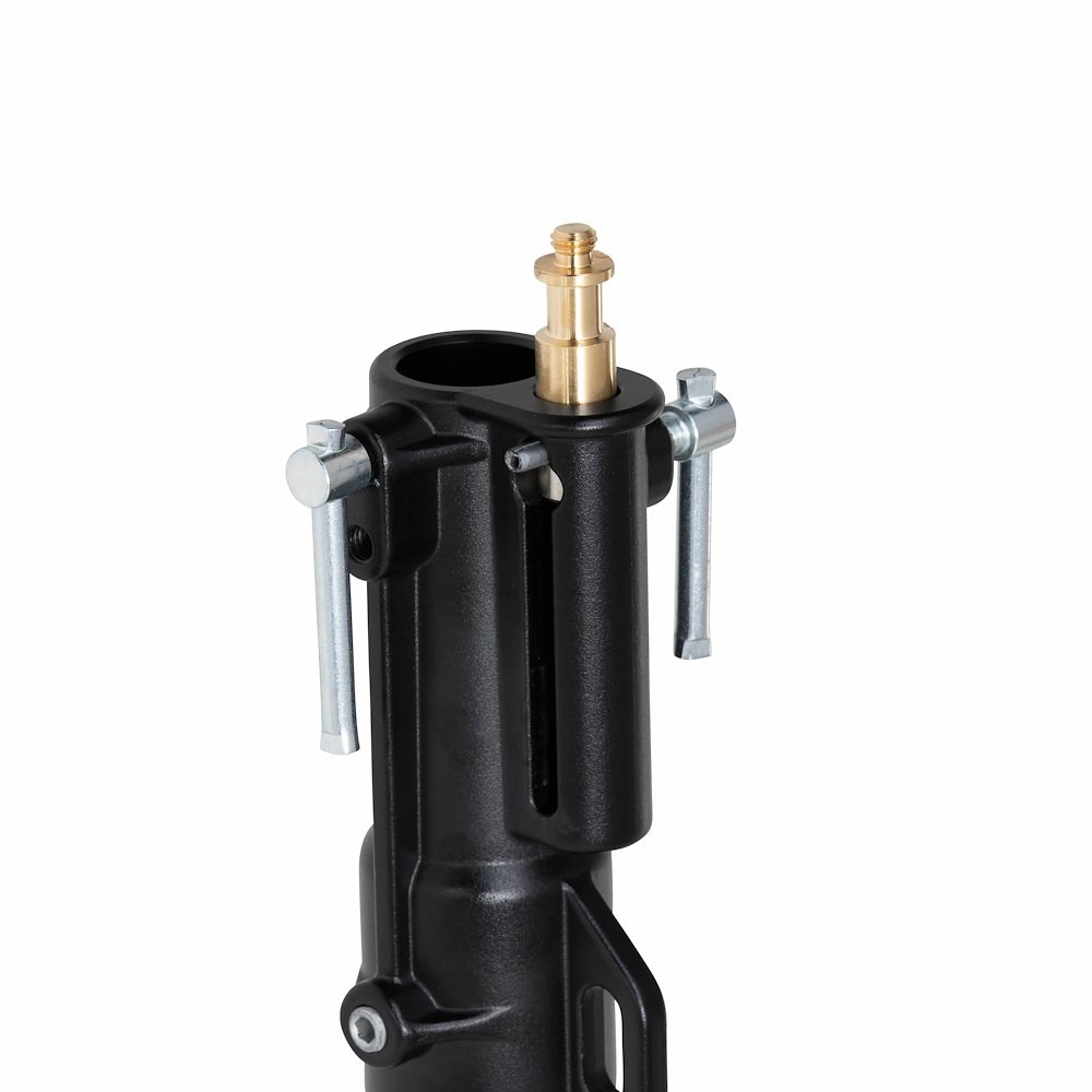 Manfrotto 298B kombinira široku crnu čeličnu paukovu bazu (s tri kotačića koja se mogu zaključati i jednom podesivom nivelirajućom nogom) i tri srebrna aluminijska dijela koja se glatko protežu do 300 cm pomoću dvaju podizača. Pravokutne čelične noge se sklapaju radi transporta, dok nivelirajuća noga kompenzira neravne podove do ±15°. Opremljen odvojivim malim klinom od 5/8" (16 mm) plus navojem od 3/8"-16 (dostupan je reduktor od 1/4"-20), savršen je za portretne studije, video setove ili setove za najam kojima je potreban stabilan stalak na kotačima koji može podnijeti 15 kg izbliza ili 5 kg u punoj visini - provjerena izdržljivost za svakodnevnu profesionalnu upotrebu.