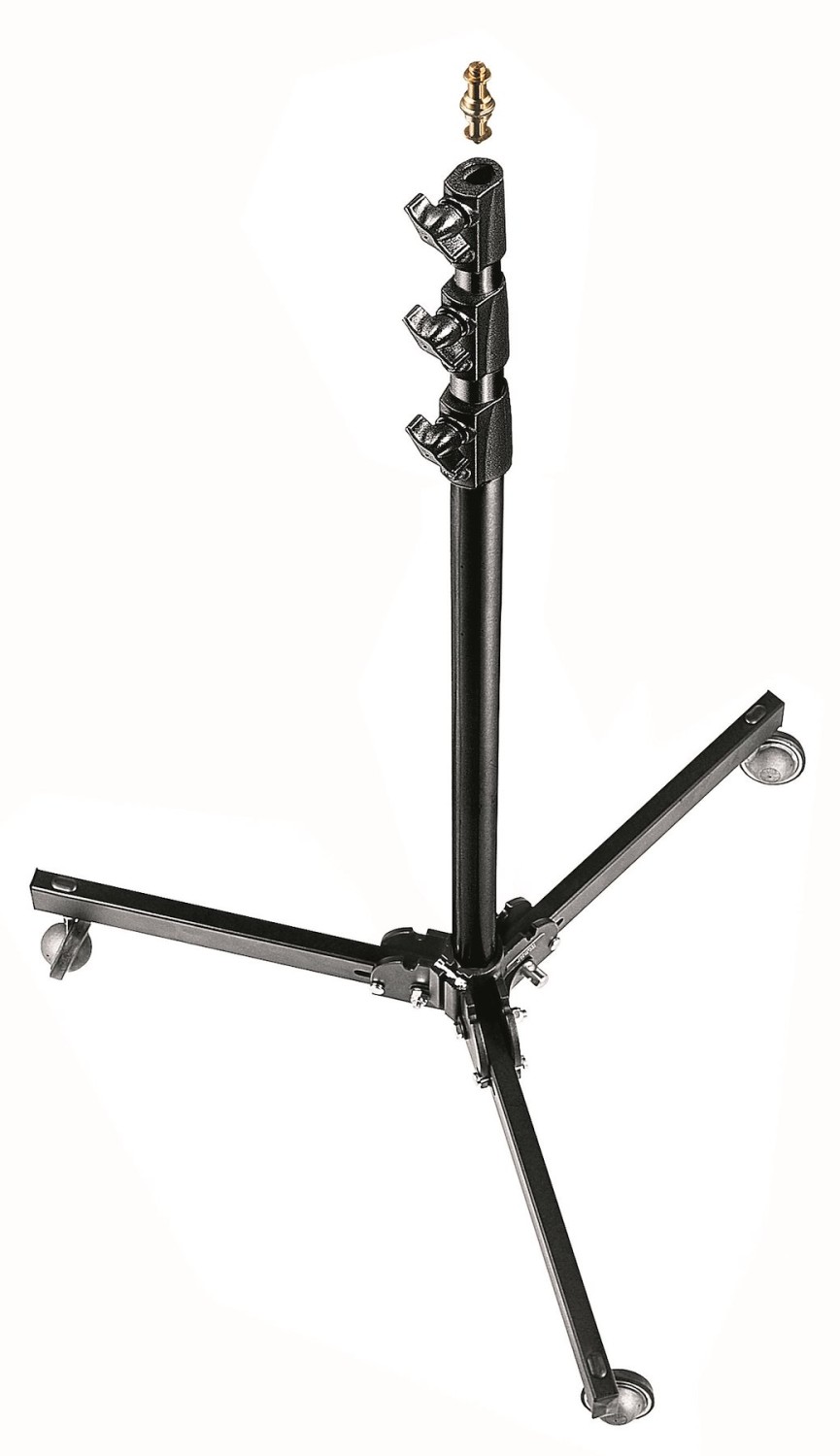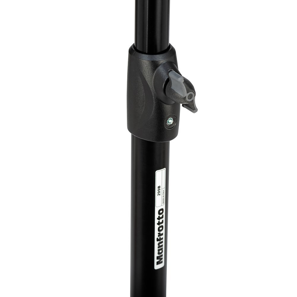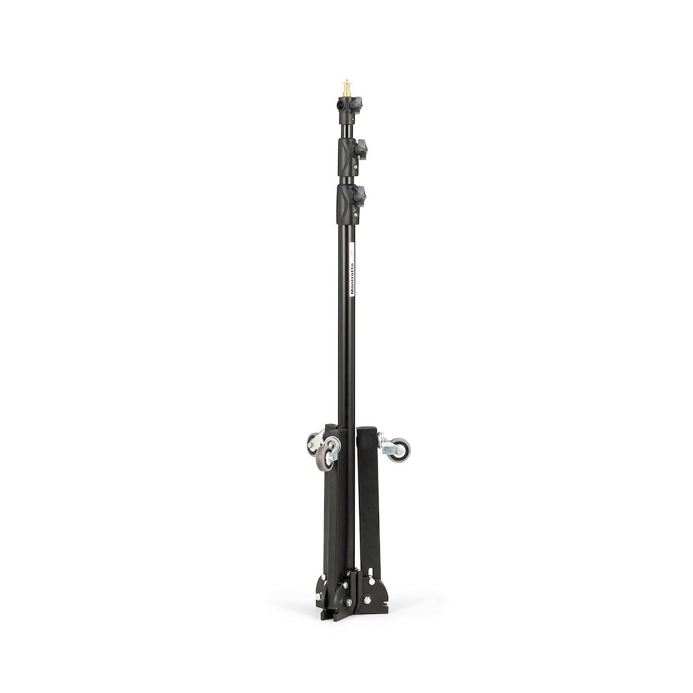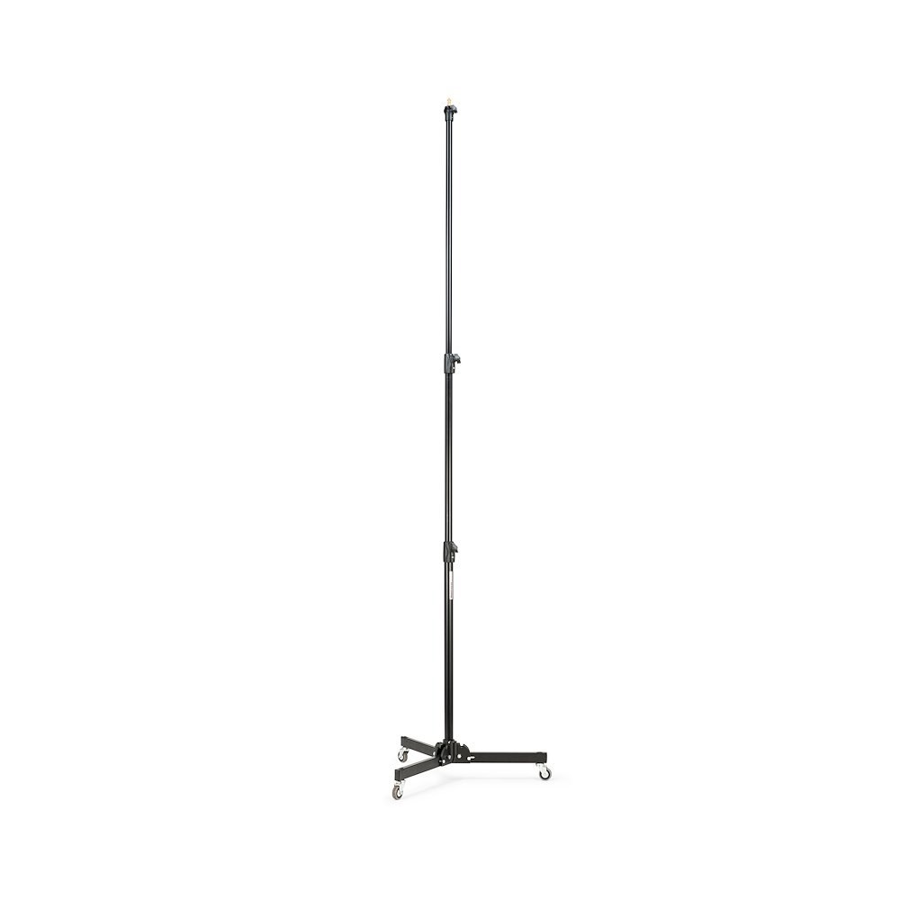 Manfrotto 299B je klasični crni čelični niski stalak sa srebrnim anodiziranim aluminijskim podizačima, kotačima s kočnicama i jednom nivelirajućom nogom – doseže 272 cm uz sigurnu potporu od 12 kg (2,2 kg pri punom istezanju). Njegov široki, stabilni otisak i ugrađeni kotači čine ga idealnim studijskim stalakom za nadzemnu rasvjetu, velike softboxove…