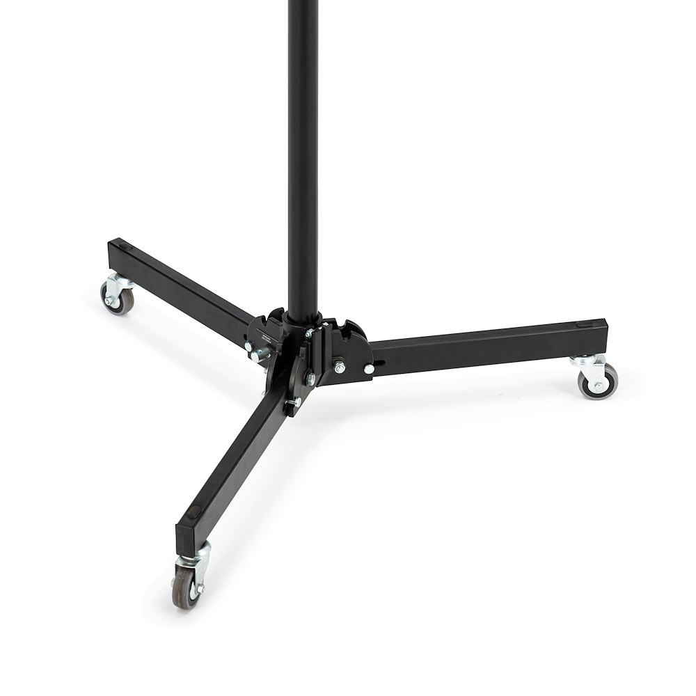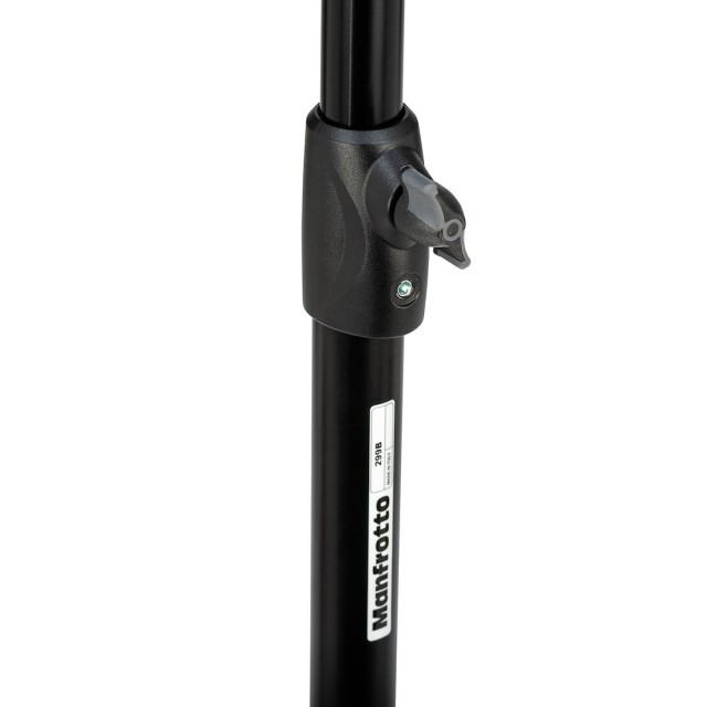 Manfrotto 299B je klasični crni čelični niski stalak sa srebrnim anodiziranim aluminijskim podizačima, kotačima s kočnicama i jednom nivelirajućom nogom – doseže 272 cm uz sigurnu potporu od 12 kg (2,2 kg pri punom istezanju). Njegov široki, stabilni otisak i ugrađeni kotači čine ga idealnim studijskim stalakom za nadzemnu rasvjetu, velike softboxove ili pozadinske nosače.