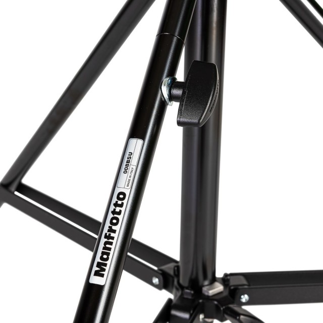 Manfrotto 008BSU Junior stalak kombinira robusnu izdržljivost s pametnim inženjeringom u crnom pocinčanom okviru. Dva dijela s jednim podizačem glatko se rasklapaju pomoću ovratnika do maksimalne visine od 216 cm, dok okrugle noge s dvostrukim ojačanjima i otisak od 110 cm osiguravaju nulto savijanje pod opterećenjem od 30 kg. Univerzalna glava tipa 14 ima ženski nastavak od 28 mm i mali klin od 16 mm s osiguračem za bilo koji standardni nosač.