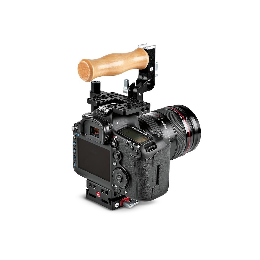 Manfrotto MVCCM srednji kavez za kameru je lagani, po visini podesivi aluminijski nosač za DSLR fotoaparate srednje veličine i fotoaparate bez zrcala (Canon 5D/6D/7D/80D serija, Nikon D500/D750/D850, itd.). Nudi više navoja od 1/4″ i 3/8″, Arri-standardne i Manfrotto točke protiv rotacije, reverzibilnu/sklopivu gornju ručku koja se pretvara u bočnu ručku, ugrađeni hladni priključak, stezaljku za šipku od 15 mm i uključenu stezaljku za HDMI kabel - pretvarajući vaš fotoaparat u potpuno prilagodljiv video/hibridni nosač uz dodavanje samo 540 g.