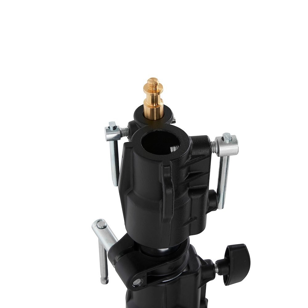 Manfrotto 070CSU je klasični stalak koji se nalazi na pozornicama i u studijima diljem svijeta. Njegova konstrukcija od čelika, kromirana i dvostruko ojačanje nogu daju mu ogromnu nosivost od 40 kg, a istovremeno održava nisko težište. Jedna noga je teleskopski podesiva za brzo niveliranje na neravnim podovima ili pozornicama, a široki otisak od 105 cm s nogama promjera 30 mm osigurava izvrsne performanse čak i pod teškim reflektorima od 2 kW ili velikim rasvjetnim tijelima. Univerzalna glava prihvaća 28 mm juniorske prijemnike, 16 mm Baby pinove ili izravno pričvršćivanje vijcima od 3/8″, a opcionalni kotači 103/104/104G pretvaraju ga u stalak na kotačiće u sekundama.