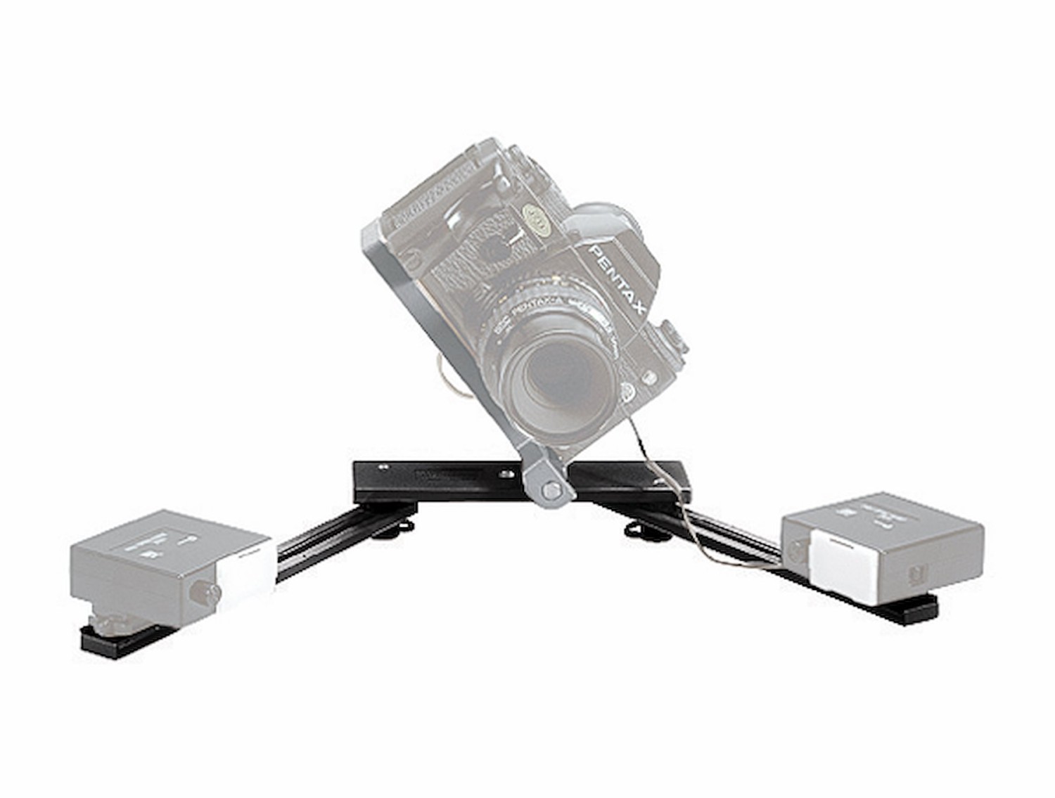 Manfrotto 330B makro nosač omogućuje montažu dvije bljeskalice uz kameru na glavu stativa, nudeći svestrane mogućnosti osvjetljenja za makro fotografiju.