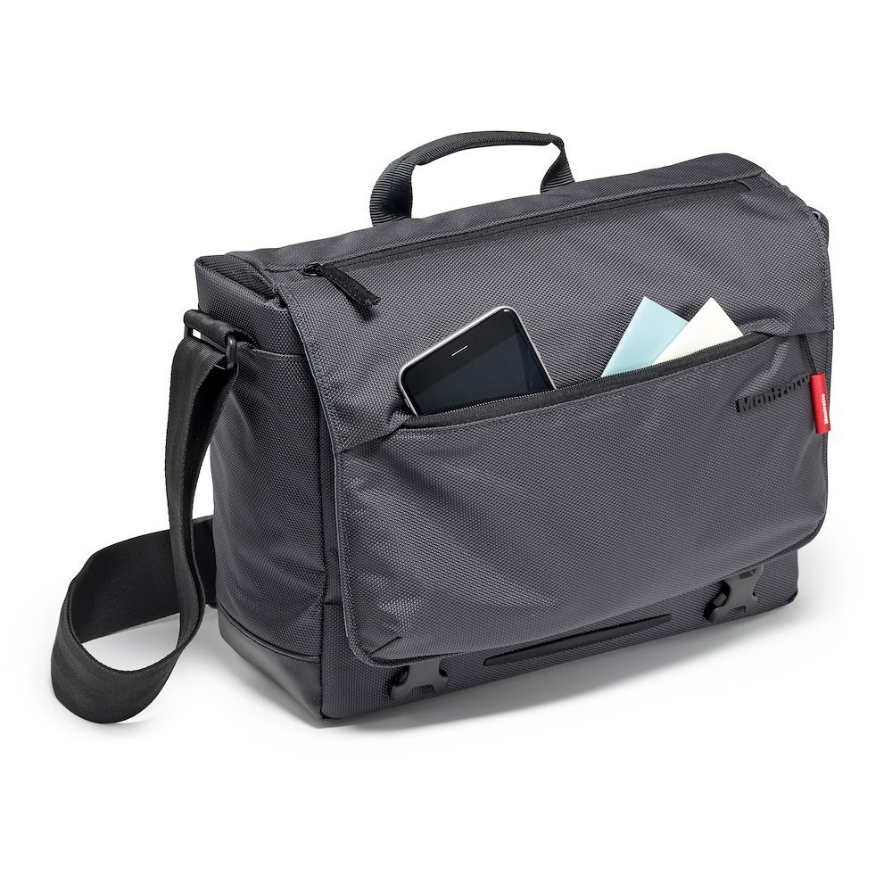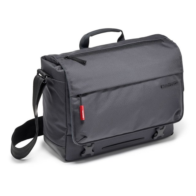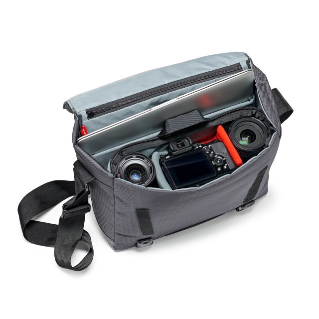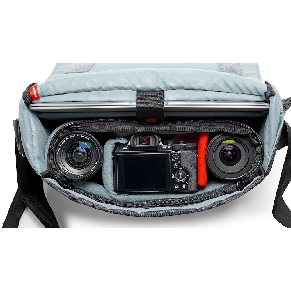 Manfrotto MB MN-M-SD-10 Manhattan Speedy-10 Messenger je siva balistička najlonska urbana torba od 880 g s uklonjivim Flexy Camera Shell umetkom (26 × 10 × 19 cm), džepom za prijenosno računalo od 12", skrivenim preklopom za stativ, stabilizacijskim remenom i vodoodbojnim premazom - prikladna za premium CSC (A7II + 2 objektiva) ili DJI Mavic komplete za svakodnevno putovanje na posao ili gradsko snimanje.