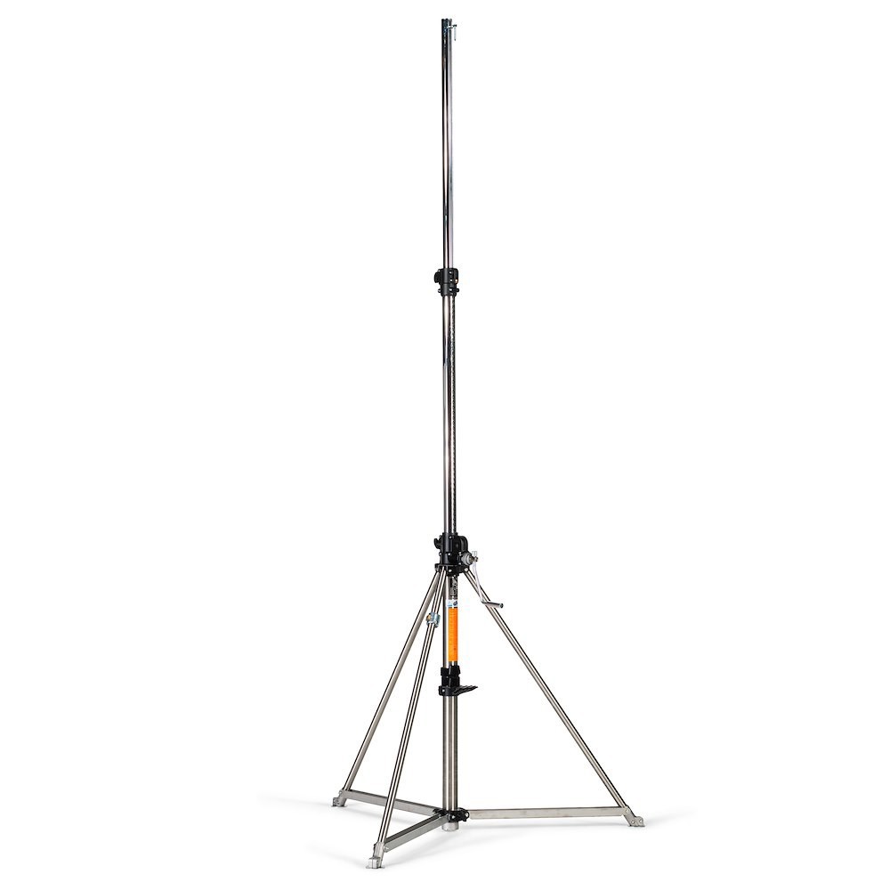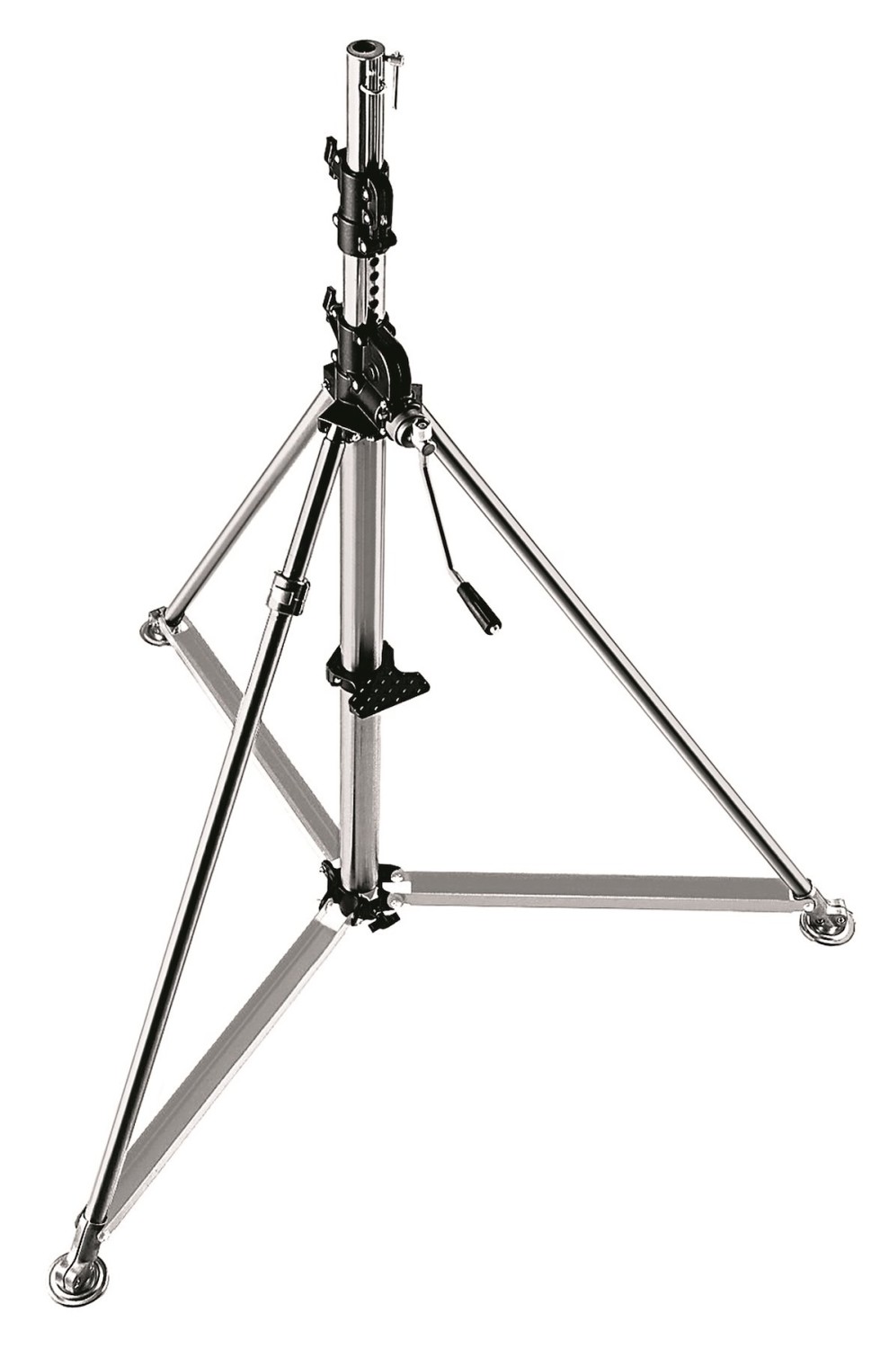 Manfrotto 387XU Stainless Steel Super Wind Up je vrhunski studijski stalak za teška opterećenja: TÜV certificirani, nosivosti 80 kg, kromirani stalak duljine 3,66 m s trostrukim stupovima za navijanje (70/60/50 mm), dvama podizačima, nogom za niveliranje i dimenzijama od 180 cm.