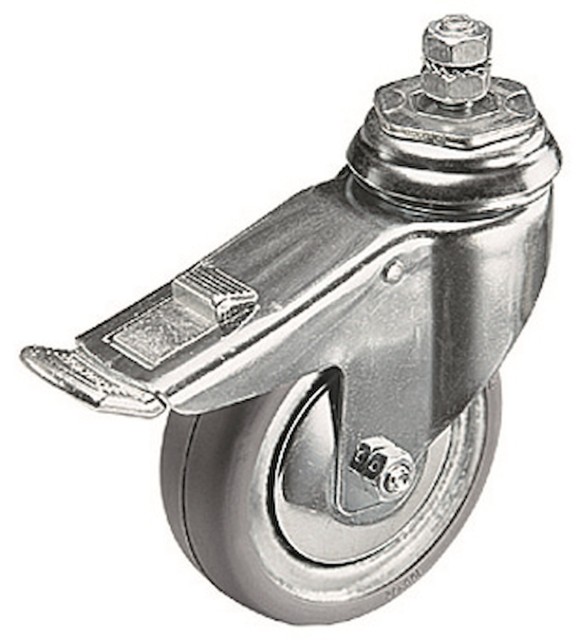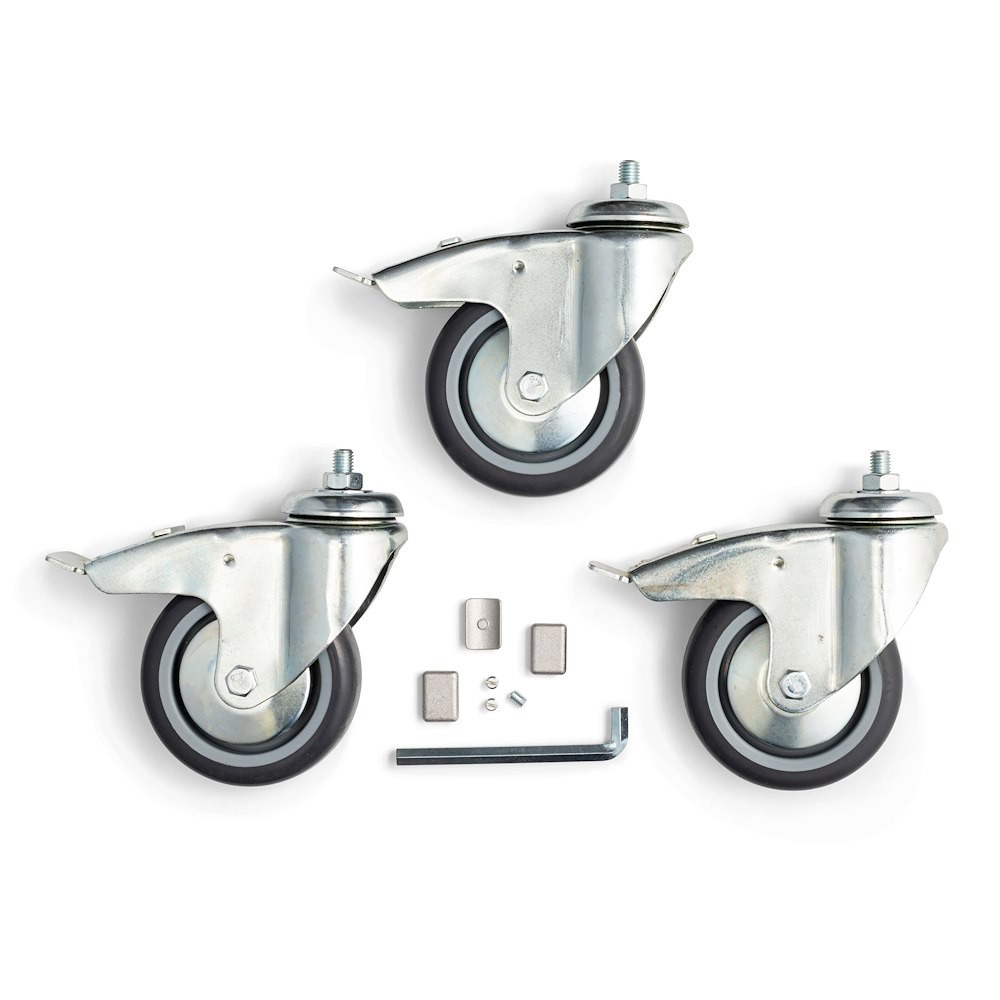 Manfrotto 104G je set od tri kotača s kočnicom od 100 mm i navojnim vijcima M10, koji podržavaju ukupnu nosivost od 100 kg - omogućujući glatko, zaključavajuće kotrljanje za većinu stalaka s navojem M10 (npr. 087NW, 475B, 269HDB) u robusnom studijskom kompletu kolica od 3 kg.