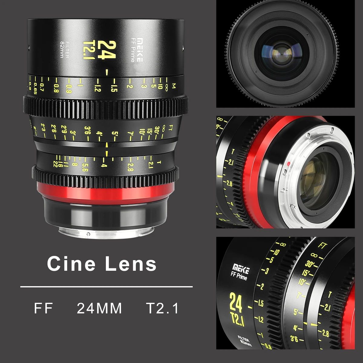 Objektiv Meike 24 mm T2.1 iz serije FF-Prime Cine ima kružni promjer od 45 mm, kompatibilan je sa svim FF kamerama i dolazi s PL/EF/RF/E/L bajonetom. To ga čini kompatibilnim sa Sony, Panasonic, Canon, Sigma i Leica DSLM fotoaparatima opremljenim senzorima veličine FF/Super 35/APS-C i Canon C700, Sony Venice, Alexa LF,…