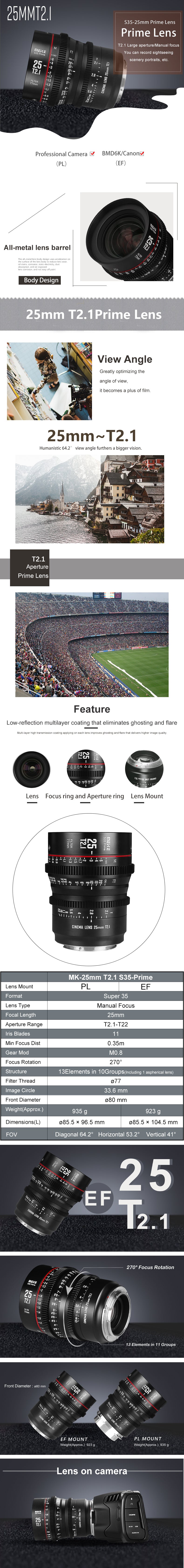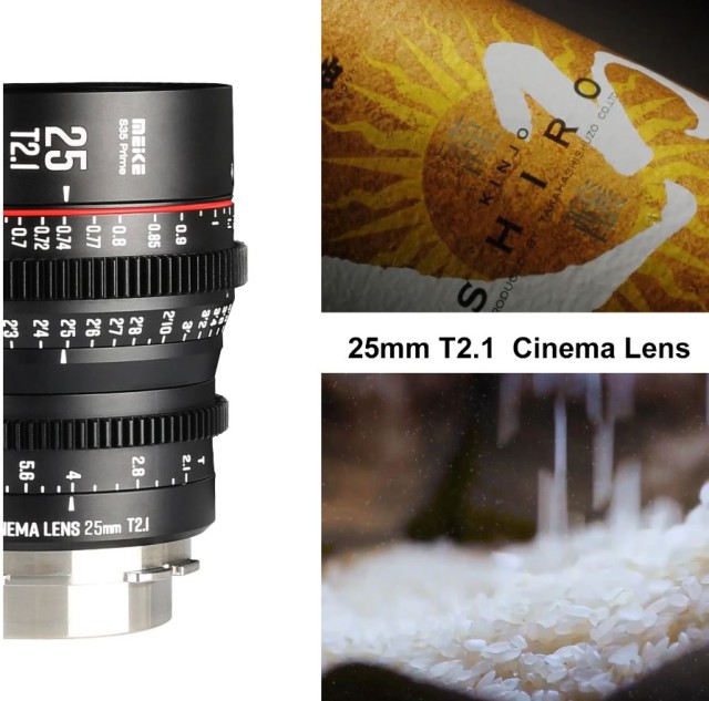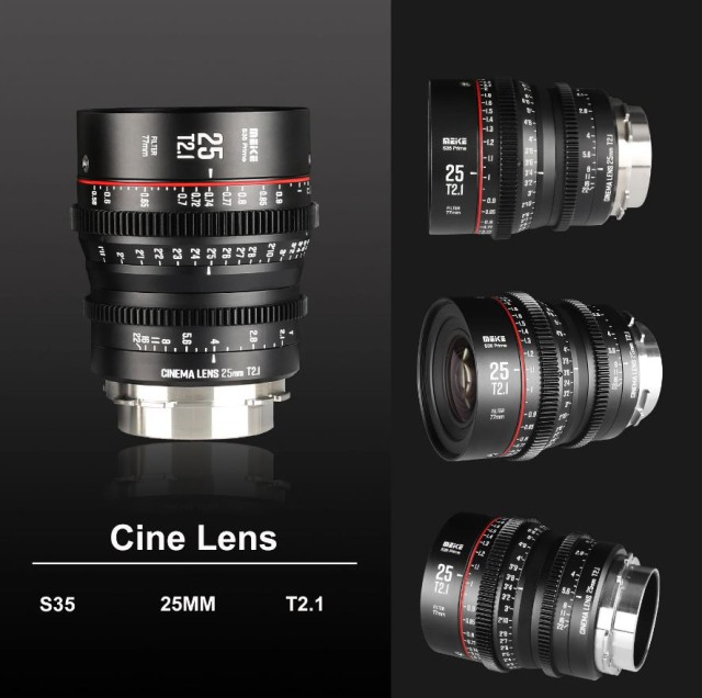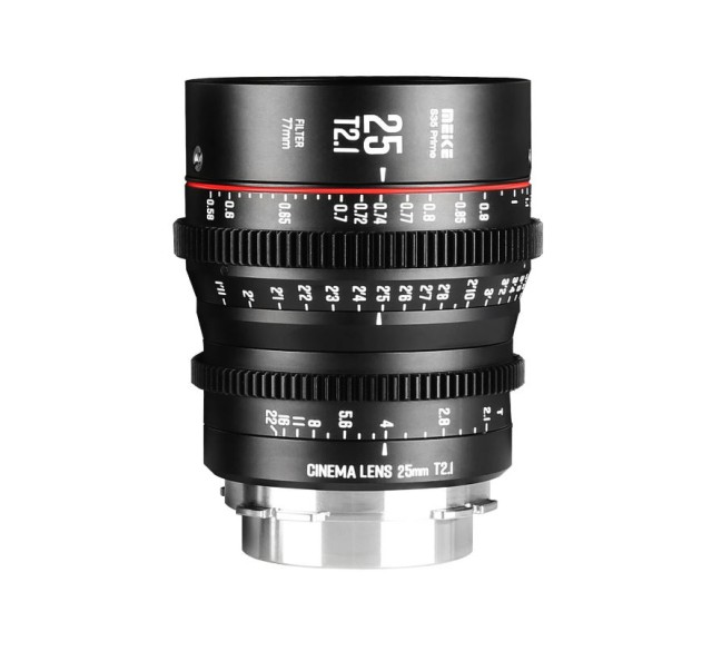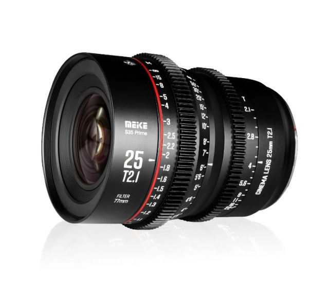 Četvrti Meike filmski objektiv iz serije Super35-Prime Cine Lens: Meike 25mm T2.1. S krugom slike od 33,6 mm, prikladan je za fotoaparate formata Super 35 i dolazi s dva nosača, PL/EF. Ovaj objektiv jedan je od Meikeovih filmskih objektiva u novoj Super35-Prime seriji filmskih objektiva. Ima standardni korak zupčanika od 0,8 mm na fokusu i prstenu otvora blende.