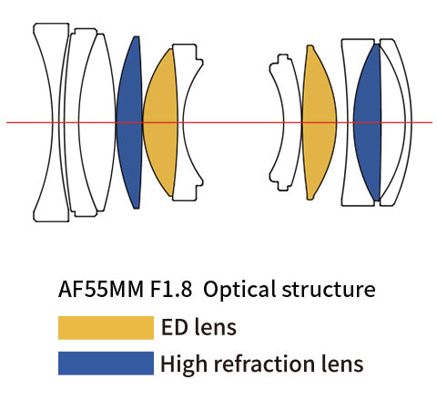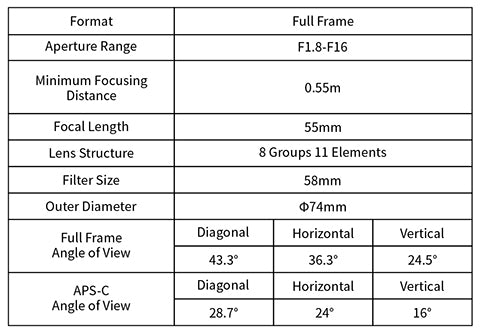 Dvostrani višeslojni premaz leće, 2 ED leće, 2 leće s visokim lomom , 1 leća s ultra-visokim lomom, učinkovito kontrolira CA, duhove, odbljesak. Najmanja udaljenost fokusiranja doseže 0,55 m, a sposobnost snimanja makro fotografija jednako je impresivna.