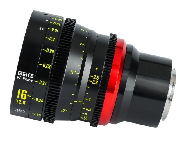 Ovo je Meikein šesti FF filmski objektiv koji se pridružio obitelji FF filmskih objektiva. Pokriva krug slike od 45 mm. Dostupan s PL, Canon EF, Canon RF, Sony E i Panasonic L nosačima. Kompletan komplet uključuje 16mmT2,5,24mm,35mm,50mm,85mm,105mmT2,1,135mmT2,4 objektive. Objektiv je opremljen standardnim zupčanicima s korakom od 0,8 mm na prstenovima fokusa i otvora blende. konstrukcija objektiva Meike 16 mm T2.5 FF-Prime sastoji se od šesnaest članova u jedanaest skupina. mehanizam otvora sastoji se od 11 lamela. Minimalna udaljenost fokusa je 30 cm.