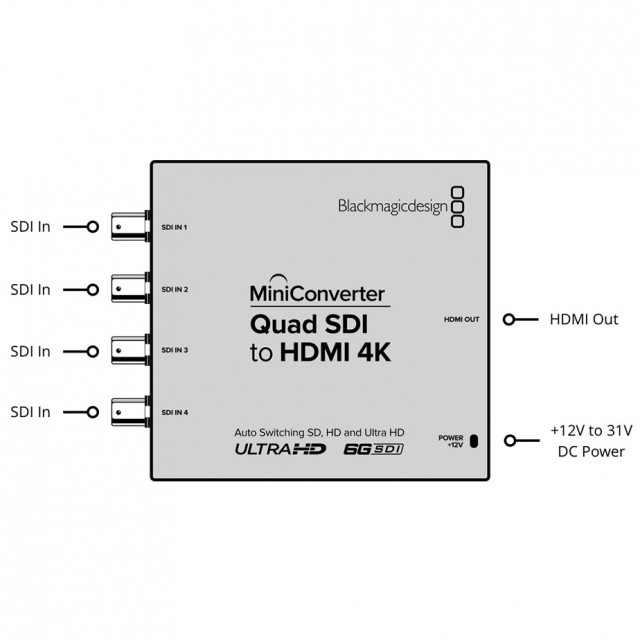 Povežite UHD/4K video izvore s 6G‑SDI, Dual-Link 3G‑SDI ili Quad-Link HD‑SDI izlazima na najnovije Ultra HD TV-e i projektore s HDMI ulazom. Mini Converter Quad SDI to HDMI 4K automatski se prebacuje između standarda SD/HD i Ultra HD/4K i podržava UHD do 2160p30 ili 4K DCI 24p/25p.