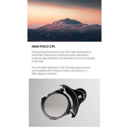 MOFAGE kružno-polarizacijski (CPL) filter je vrhunski ugradbeni filter dizajniran za POCO adapter sustav, koji nudi neusporedivu kontrolu nad refleksijama i bojom. Ima standardni kino 0,8 modulni zupčanik za preciznu, motoriziranu rotaciju od 36 0 ∘ , što snimateljima omogućuje daljinsko uklanjanje refleksija, produbljivanje kontrasta neba i maksimiziranje zasićenosti boja.