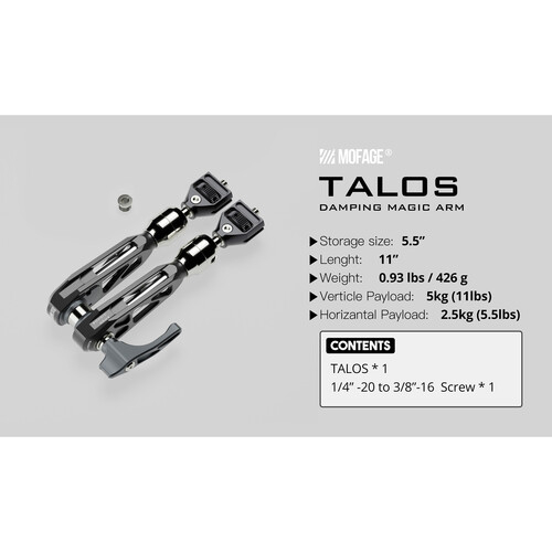 Mofage Talos Damping Magic Arm – Black je visokokvalitetna zglobna ruka , idealna za fotografe, snimatelje i kreatore sadržaja koji trebaju čvrsto, podesivo rješenje za montažu . Sadrži dvostruke podesive kuglaste glave s 1/4"-20 vijcima na svakom kraju, što omogućuje precizno pozicioniranje kamera, monitora, LED svjetala i druge opreme .