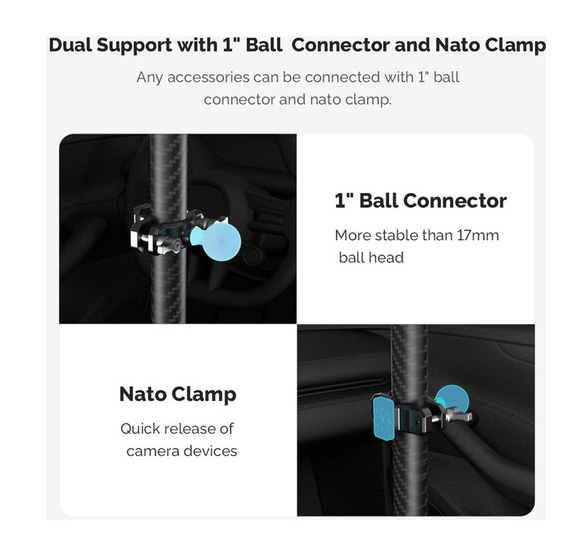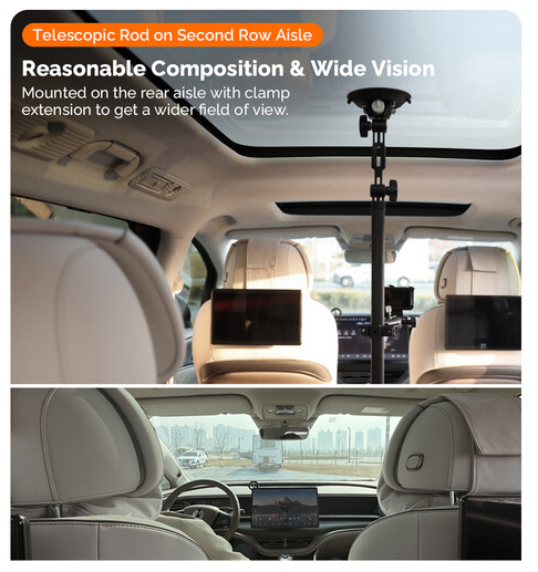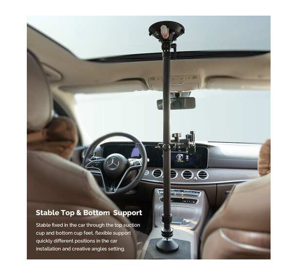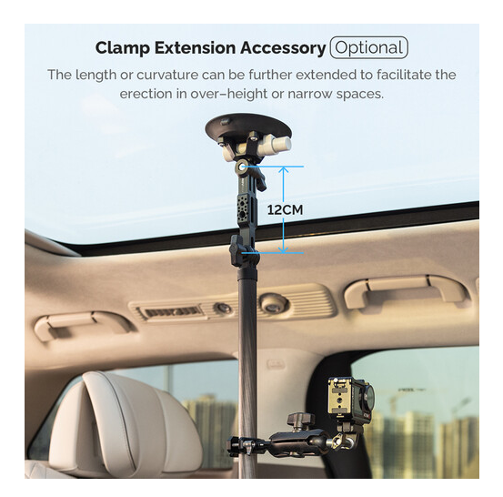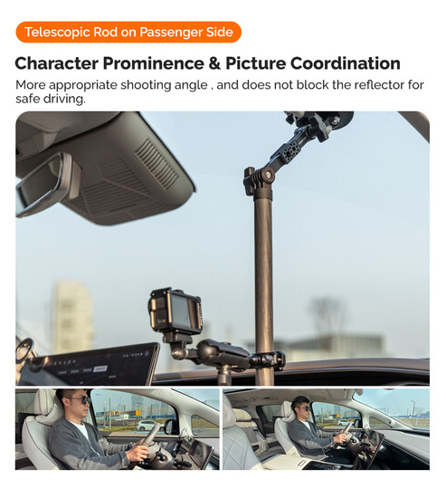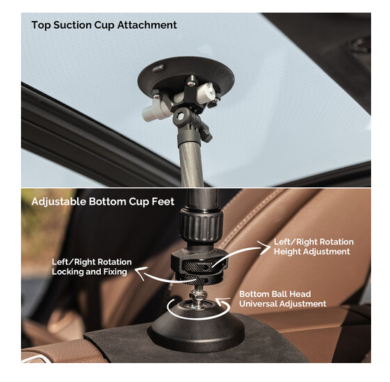 MOVMAX Podesiva teleskopska šipka s vijkom 1/4"-20 je lagani, visokočvrsti sustav nosača od karbonskih vlakana dizajniran za sigurnu montažu akcijske ili filmske kamere bez vibracija unutar vozila, savršen za čiste POV snimke kroz vjetrobransko staklo. Šipka se besprijekorno podešava od 2,5 do 4,1 stope (75–125 cm) putem sigurnog mehanizma zakretnog zaključavanja, prilagođavajući se kompaktnim automobilima i SUV-ovima. Gornja vakuumska čašica čvrsto se pričvršćuje na staklo krovnog otvora, dok se donja noga pričvršćuje na središnju konzolu ili nadzornu ploču, stvarajući krutu trokutastu strukturu koja minimizira podrhtavanje čak i tijekom agresivne vožnje. Ovaj komplet uključuje kuglastu glavu od 1" s muškim vijkom od 1/4"-20 za izravno pričvršćivanje kamere, dvostruku kuglastu ruku od 3,9" za potpuno panoramiranje od 360° i podešavanje nagiba od ±90° te namjensku stezaljku za šipku s integriranom kuglastom glavom za dodavanje monitora, svjetala ili sekundarnih kamera. Idealan za automobilsku kinematografiju, izvještavanje o motosportu i vlogiranje, sustav kombinira vrhunske materijale, preciznu artikulaciju i pouzdano vakuumsko prianjanje za profesionalnu stabilnost u automobilu.