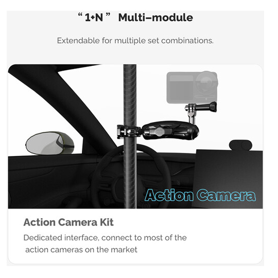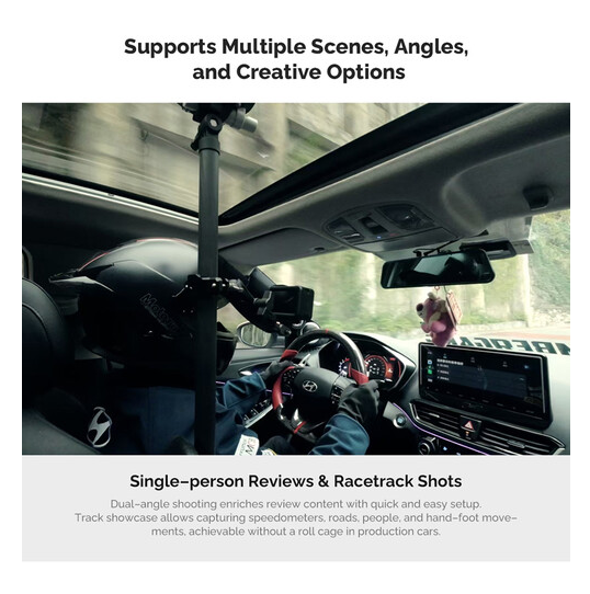 MOVMAX podesiva teleskopska šipka s stezaljkom za pametni telefon pruža profesionalno rješenje bez upotrebe ruku za snimanje glatkih, visokokvalitetnih POV snimaka kroz vjetrobransko staklo vozila pomoću pametnih telefona ili kompaktnih mobilnih uređaja. Izrađena od vrhunskih karbonskih vlakana, šipka se glatko proteže od 75 do 125 cm putem sigurnog sustava zaključavanja okretanjem, prilagođavajući se raznim interijerima vozila, od limuzina do SUV-ova. Gornja vakuumska čašica pouzdano se pričvršćuje na krovni prozor, dok se donja noga pričvršćuje na središnju konzolu ili nadzornu ploču, tvoreći kruti, otporni na vibracije okvir idealan za vožnju velikom brzinom ili izvan ceste. Ovaj komplet uključuje stezaljku za pametne telefone s oprugom i integriranom kuglastom glavom od 1" (odgovara uređajima širine 2,2–3,5"), dvostruku kuglastu ručicu od 3,9" za panoramiranje od 360° i potpunu kontrolu nagiba te stezaljku za šipku s kuglastom glavom za pričvršćivanje sekundarne opreme poput svjetala ili mikrofona. Savršen za vlogere, automobilske recenzente i mobilne filmaše, sustav osigurava precizno kadriranje, minimalno podrhtavanje i maksimalnu kreativnu fleksibilnost u dinamičnim okruženjima snimanja u automobilu.
