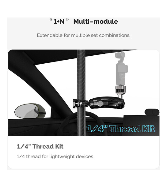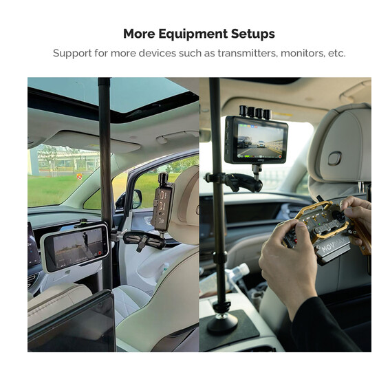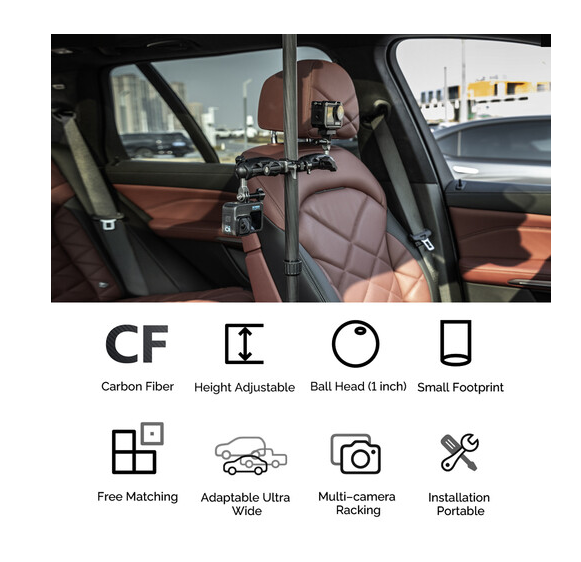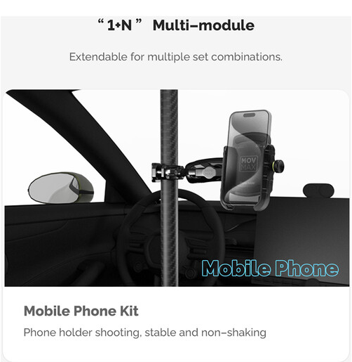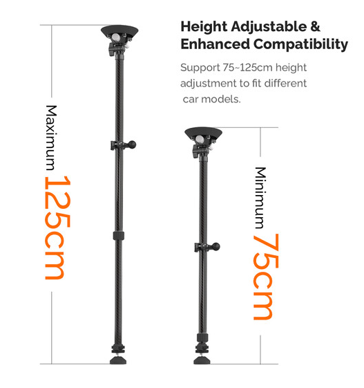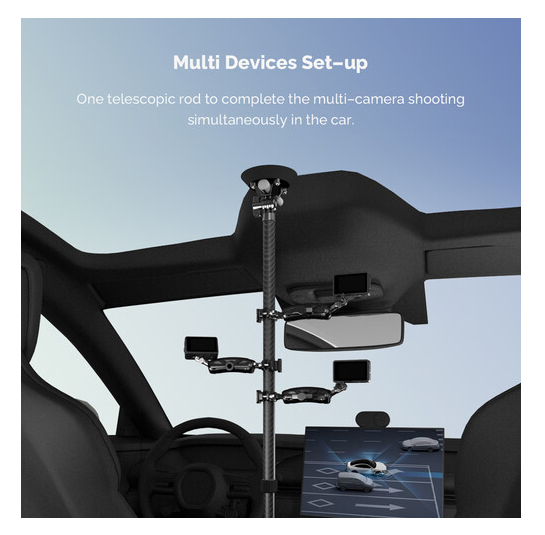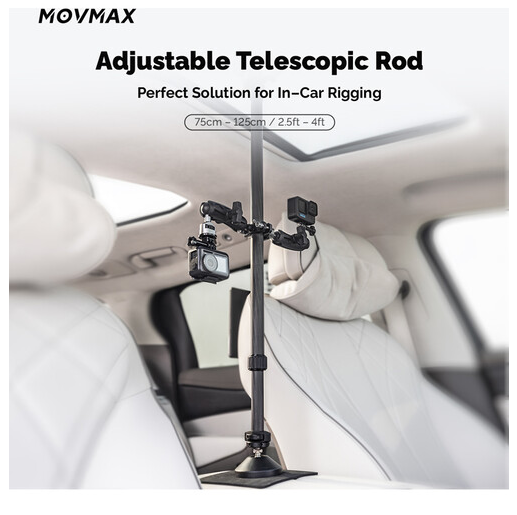 MOVMAX podesiva teleskopska šipka s stezaljkom za pametni telefon omogućuje stabilno snimanje vjetrobranskog stakla u automobilu pomoću mobilnih uređaja, proteže se od 75 do 125 cm s laganom konstrukcijom od karbonskih vlakana, dvostrukim vakuumskim čašicama za krovni otvor i središnju konzolu, plus uključena stezaljka za pametni telefon s kuglastom glavom, dvostruka utičnica od 9,4 cm i stezaljka za šipku s kuglastom glavom za potpuno podesivo pozicioniranje.
