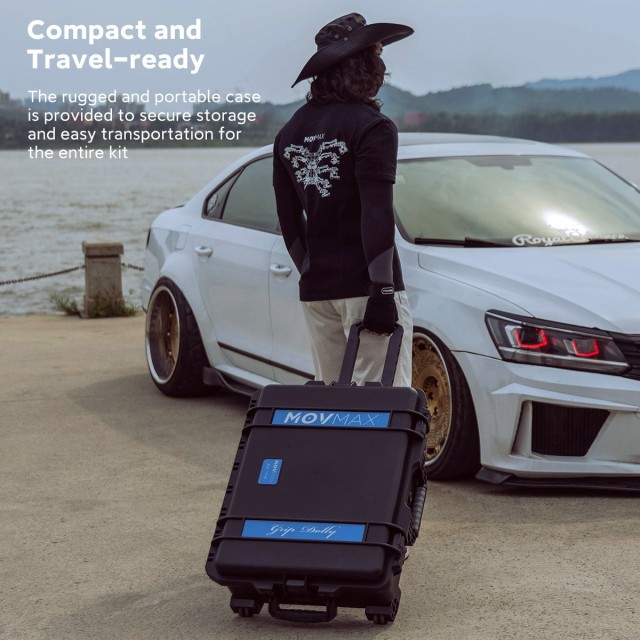 MOVMAX Grip Dolly Pro Kit je teški sustav kolica s nosivošću od 89 kg. Uključuje ravnu ploču, kuglične adaptere od 75/100/150 mm, Mitchell adapter za ploču i polimerne kotače za stabilno kretanje. Kolica imaju više navoja od 1/4"-20 i 3/8"-16, srednje i bočne nosače te dolaze s kovčegom za jednostavan transport i skladištenje.