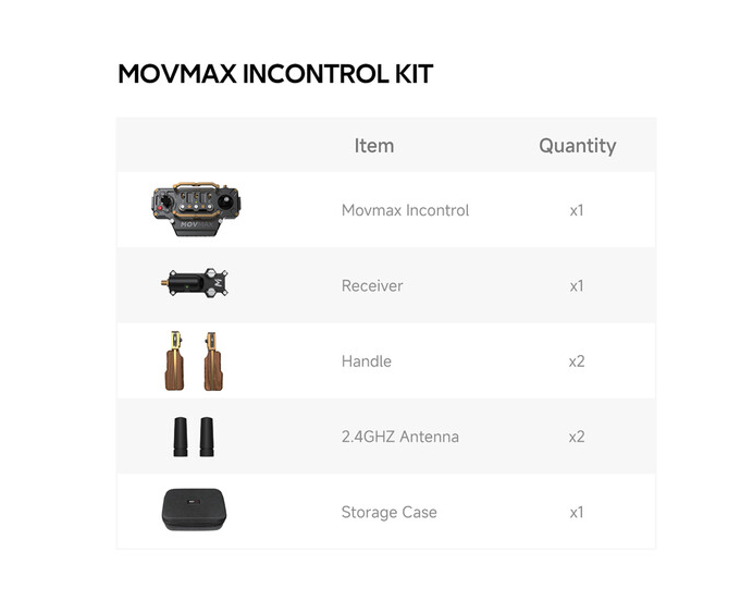 MOVMAX Incontrol bežični kontroler za DJI Ronin pruža precizno, prilagodljivo upravljanje gimbalom do 150 m putem 2,4 GHz, s podesivim postavkama brzine/zone u tri osi, centriranjem jednim klikom, okidačem za snimanje, teleskopskim joysticcima od karbonskih vlakana, odvojivim drvenim ručkama i zamjenjivom baterijom od 3350 mAh 18650 koja nudi do 15 sati rada; potpuno kompatibilan s DJI RS 4 Pro, RS 4, RS 3 Pro i RS 2 (ne RS 3).