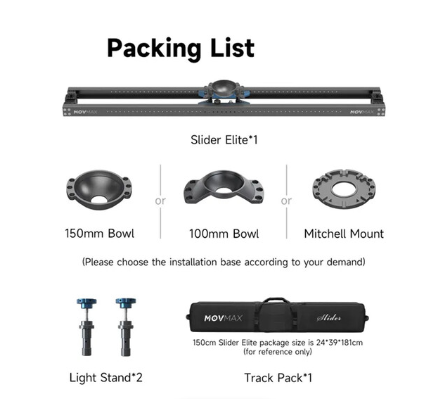 Izrađen za preciznu kinematografiju, MOVMAX Slider Elite 70" je profesionalni linearni klizač izgrađen na 70,8 inča (179,8 cm) teških aluminijskih tračnica s nosačem pokretanim trenjem koji pruža tiho i fluidno kretanje - idealno za scene dijaloga, predstavljanja proizvoda ili suptilne snimke snimanja. Integrirana platforma za praćenje uključuje nosač od 150 mm za sigurno pričvršćivanje industrijskih standardnih fluidnih glava s polukuglom, koje podnose teret do 55,1 lb (25 kg) za smještaj fotoaparata bez zrcala, DSLR-a ili kompaktnih kino platformi s priborom. Dva uključena adaptera za stalak za svjetlo s 5/8" prihvatnicima za male pinove omogućuju stabilnu elevaciju na C-stalcima ili stalcima za svjetlo, dok odsutnost ugrađenih nožica maksimizira fleksibilnost montaže. Unatoč težini pakiranja od 56 lb, uključena podstavljena torba za nošenje osigurava jednostavnu mobilnost za rad na lokaciji. Uz ograničeno jednogodišnje jamstvo, ovaj klizač kombinira tišinu, snagu i besprijekornu integraciju za besprijekorno horizontalno kretanje kamere u studijskim ili terenskim produkcijama.