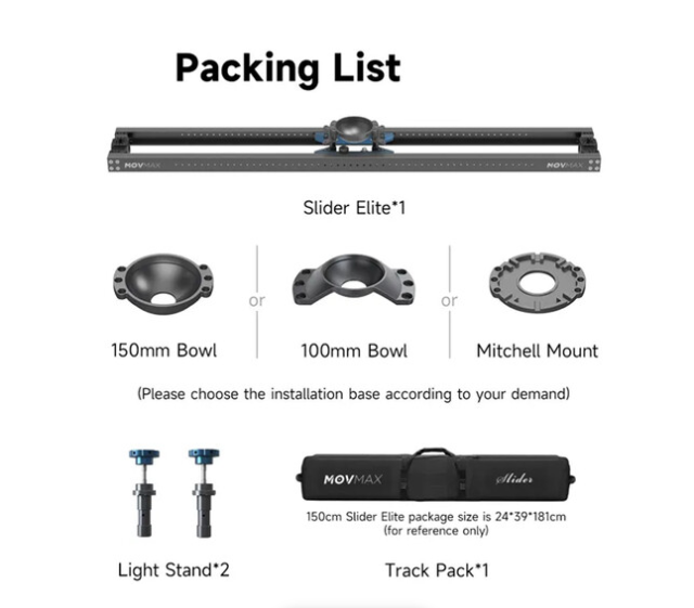 MOVMAX Slider Elite 82" (Mitchell Mount verzija) je robustan, ručno upravljani klizač za kameru, dizajniran za profesionalne filmaše kojima su potrebni dugi, fluidni horizontalni pokreti praćenja. Izrađen od teških aluminijskih tračnica i tijela, ovaj klizač od 82,6" (209,8 cm) koristi tihi klizni sustav temeljen na trenju koji pruža konzistentne performanse bez motora. Nosač za praćenje opremljen je originalnim Mitchell ravnim nosačem, što ga čini kompatibilnim s vrhunskim filmskim kamerama i fluidnim glavama koje koriste Mitchell standard. Fina kontrola osigurana je putem integriranih gumba za kočnicu i prigušivač za zaključavanje nosača ili podešavanje otpora klizanja. Fleksibilnost postavljanja poboljšana je priloženim parom adaptera za stalak za svjetlo s 5/8" baby prijemnicima, što omogućuje sigurnu montažu na C-stalke ili stalke za svjetlo. Unatoč svojoj znatnoj veličini i nosivosti od 55,1 lb, cijeli sustav se pakira u priloženu zaštitnu torbu za nošenje radi praktičnog transporta na lokaciju.
