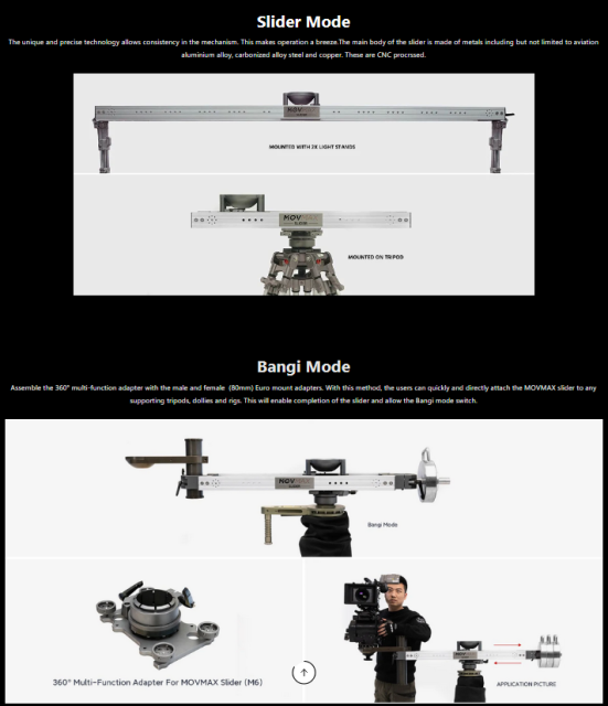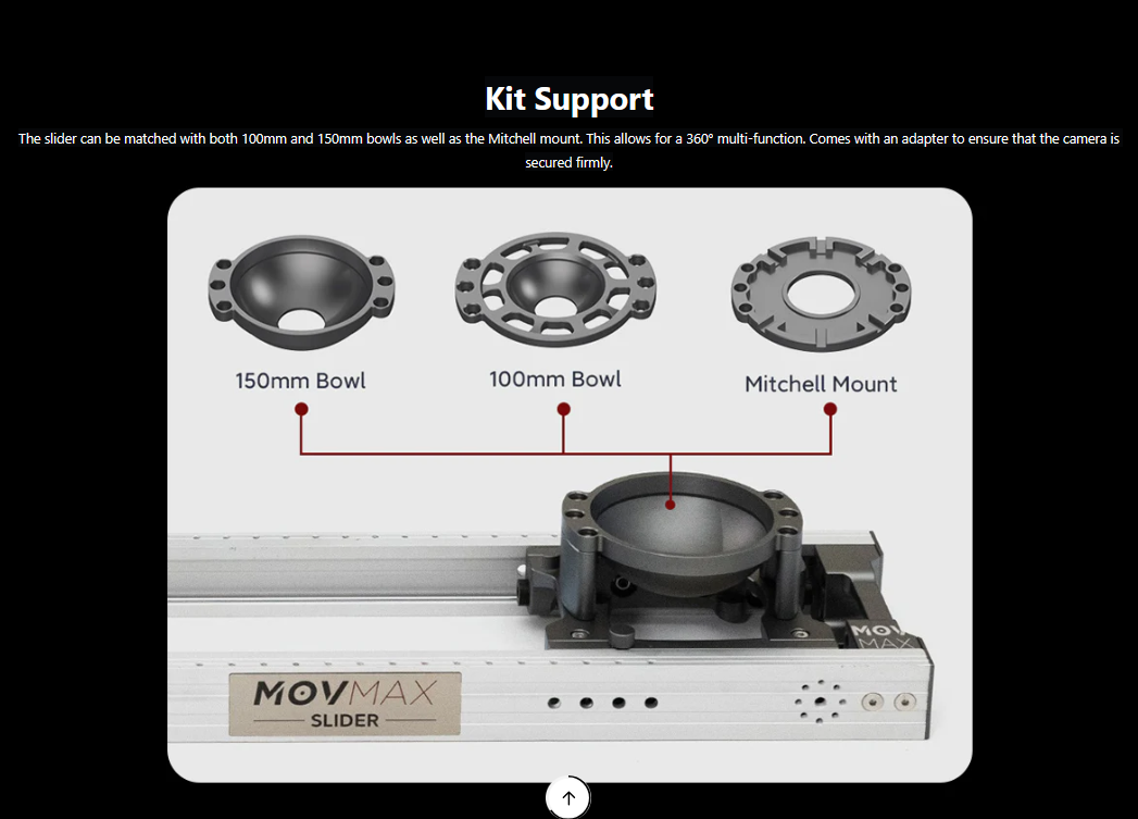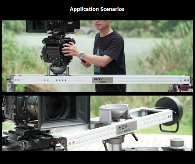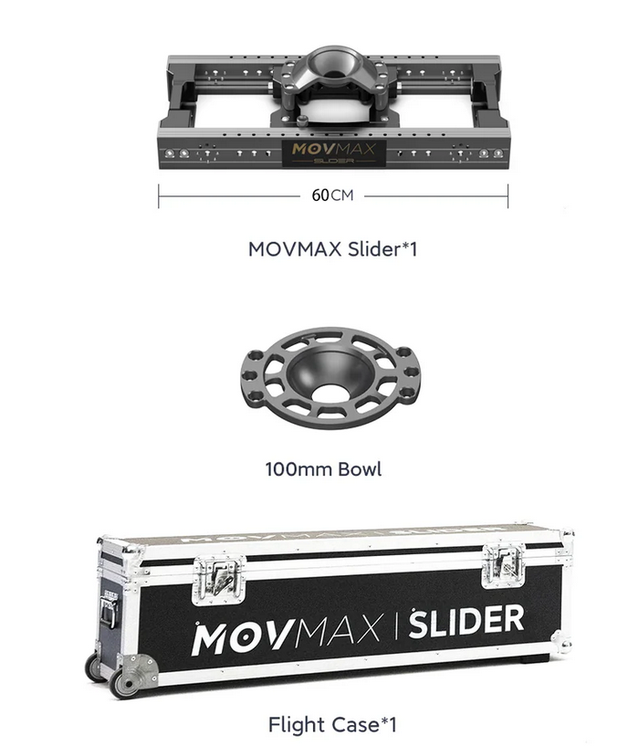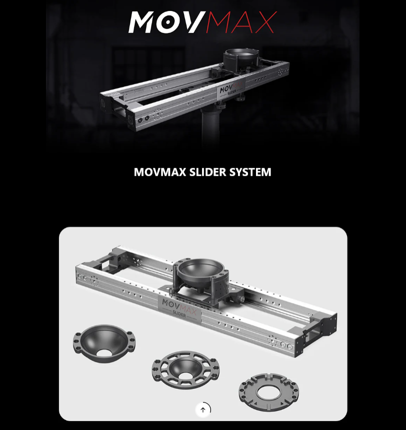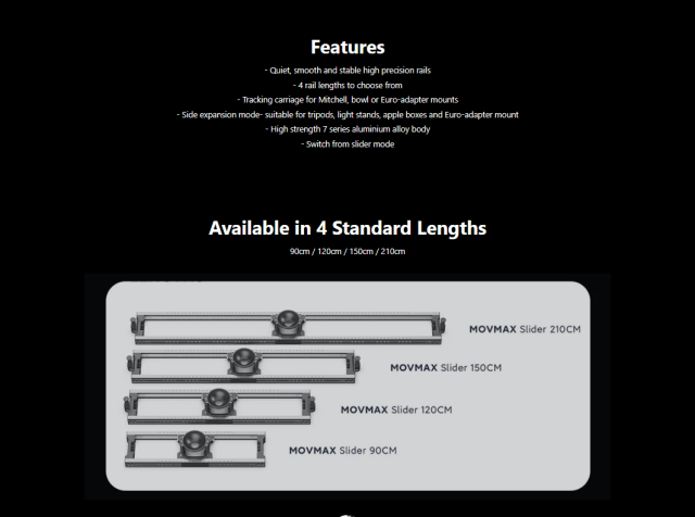 MOVMAX Slider System je precizno konstruirani klizač za kameru dizajniran za profesionalno snimanje, dostupan u duljinama od 60 cm, 90 cm, 120 cm, 150 cm, 180 cm i 210 cm. Ima tihe, glatke visokoprecizne tračnice, način bočnog širenja za korištenje sa stativima ili stalcima za svjetla te kompatibilnost s nosačima za zdjelu od 100 mm/150 mm ili Mitchell nosačem, a sve je izgrađeno na robusnom kućištu od aluminijske legure serije 7.