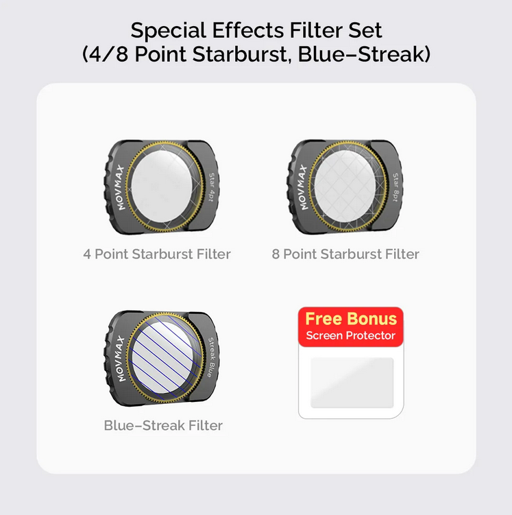 MOVMAX set filtera za specijalne efekte za DJI Pocket 3 oslobađa filmsku kreativnost s 4-točkovnim i 8-točkovnim filterima zvjezdanog sjaja koji transformiraju izvore svjetlosti poput uličnih svjetiljki i farova u blistave zvjezdane uzorke, plus filter Blue Streak za znanstveno-fantastične plave pruge oko pokretnih svjetala u noćnim scenama - sve putem magnetskog sustava za jednostavne zamjene tijekom dinamičnog snimanja.