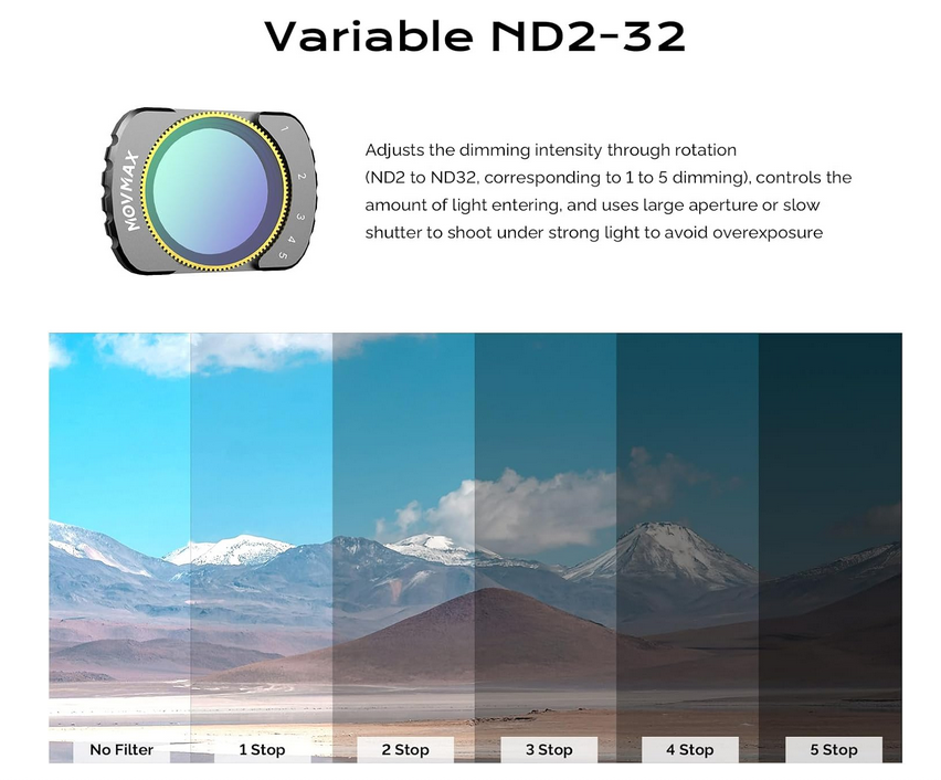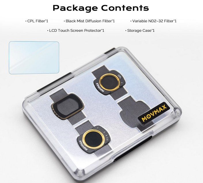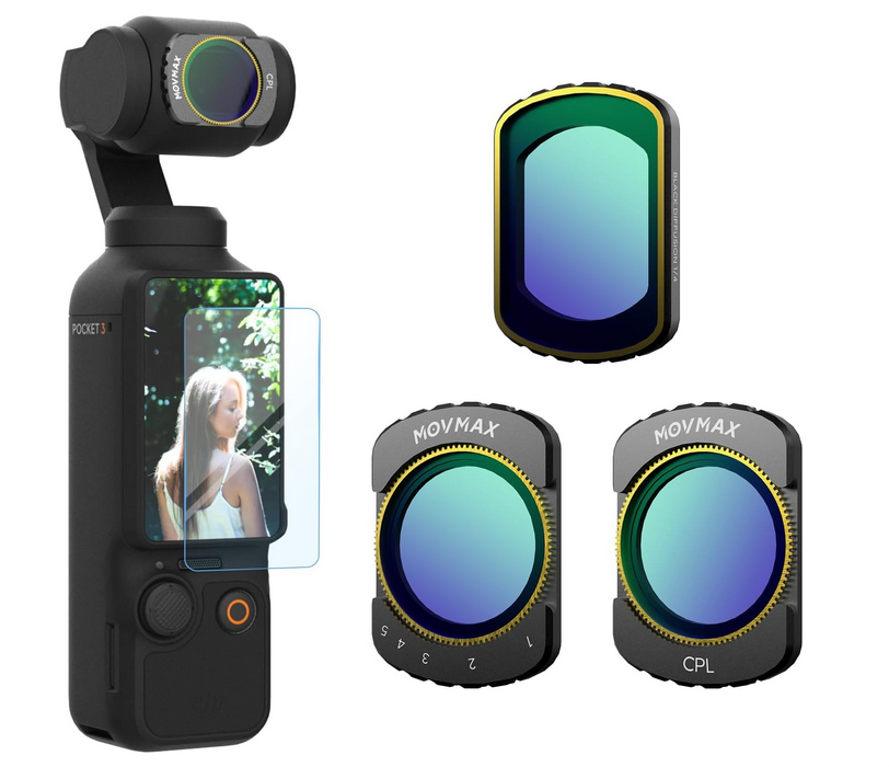 Sada magnetických filtrů MOVMAX pro DJI Osmo Pocket 3 Creator Combo obsahuje variabilní filtr ND2-32 (1–5 clonových stupňů), otočný filtr CPL a difuzní filtr Black Mist 1/4 – všechny se magnetickým uchycením pro okamžité použití – plus ochrannou fólii na LCD displej, které zajišťují filmovou kontrolu, jas bez odlesků…