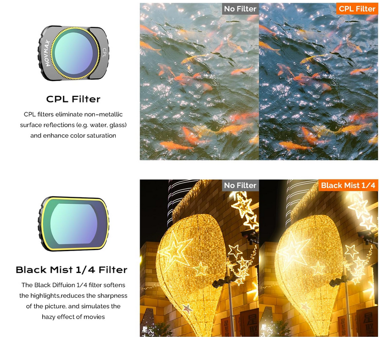 Vylepšete každý snímek pořízený Pocket 3 pomocí sady magnetických filtrů MOVMAX (číslo dílu 87-0010), která obsahuje tři výkonné filtry a ochrannou fólii na displej přizpůsobenou pro DJI Osmo Pocket 3 Creator Combo. Filtr VND2-32 nabízí plynulé snížení světla o 1–5 stupňů pouhým otočením – ideální pro časosběrné snímky východu slunce nebo sledování mraků bez nutnosti výměny pevných ND filtrů. Filtr CPL eliminuje odrazy od vody, skla nebo oken a zároveň zvýrazňuje modrou barvu oblohy, hloubku mraků a živost listoví, s možností nastavení v reálném čase pomocí otáčení. Difúzní filtr Black Mist 1/4 jemně rozostřuje světla, vyhlazuje texturu pleti a dodává jemný filmový opar, přičemž zachovává důležité detaily – ideální pro portréty a retro venkovní scény. Všechny filtry se magneticky připevňují během několika sekund k objektivovému kroužku Pocket 3, nevyžadují žádné závity, vyrovnání ani úpravy vyvážení a odpojují se jediným tahem, aby se zabránilo opotřebení. Sada je ultralehká, váží pouze 70 g, a obsahuje přesnou ochranu LCD displeje pro úplnou ochranu zařízení. Poznámka: před použitím odstraňte veškeré ochranné fólie z fotoaparátu a vyhněte se použití spolu s širokoúhlými/makro objektivy. Tato sada, na kterou se vztahuje 3měsíční záruka, je nezbytná pro vlogery, filmaře a tvůrce, kteří vyžadují profesionální optiku bez jakýchkoli překážek v pracovním postupu.