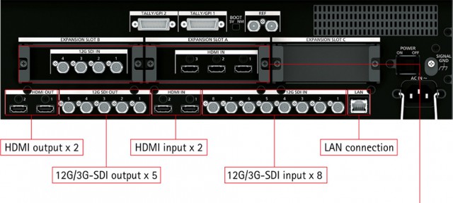 Dodatna I/O kartica za Panasonic AV-UHS500 iznad glave. 3x HDMI 2.0 izlaza, funkcija promjene rezolucije za svaki kanal.