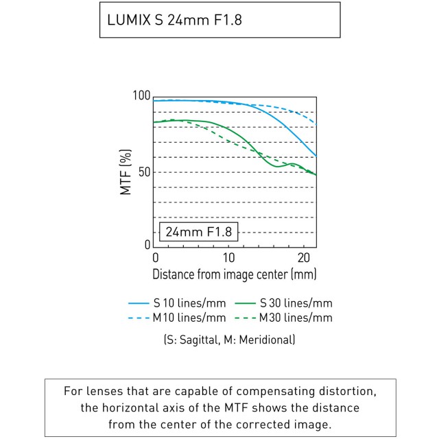 Objektiv za LUMIX S sustav (L-Mount bajonet) s fiksnim fokusom, LUMIX S 24mm f/1.8 (S-S24). Uz već spomenute modele od 85 mm (S-S85) i 50 mm (S-S50 ), ovo je sljedeći u nizu od četiri planirana objektiva koji dijele dimenzije, položaj kontrola i otvor blende f/1.8. Konstrukcija leće (12 elemenata u 11 grupa) koristi 3x asferične, 3x ED (ekstra-niska disperzija) i 1x UED (ultra ekstra-niska disperzija) leće za oštru sliku s minimalnim nedostacima u boji. Objektiv je opremljen snažnim AF sustavom (240 fps) s tihim motorom i mehanizmom za suzbijanje "disanja" za snimanje videozapisa bez problema. Zahvaljujući svom kompaktnom (74x82 mm, 310 g) i otpornom (na vlagu, prašinu i mraz do -10°C) dizajnu, prikladan je i za korištenje u pokretu zajedno s najmanjim uređajem u seriji LUMIX S, S5 model. U prodaji od 10.2021.