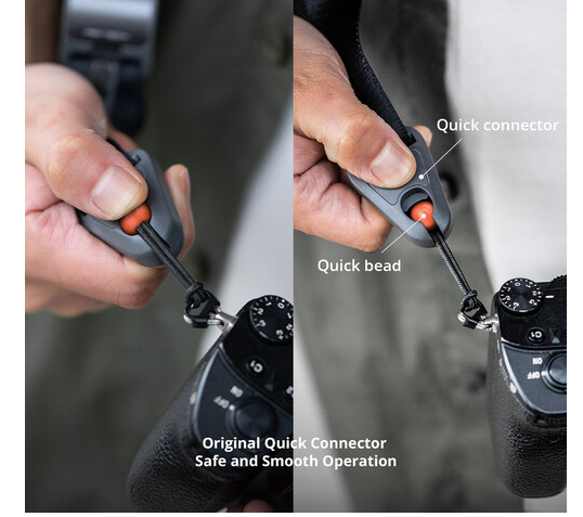 Svaki remen ima spojku s kuglicom za brzo otpuštanje i magnetski sustav zaključavanja koji drži remene pričvršćenima kada se ne koriste. Petlja spojke izrađena je od tri sloja UHMWPE-a, uključujući vanjski sloj otporan na habanje, unutarnji sloj koji se može zamijeniti i jezgru koja podnosi opterećenje, te sigurno podnosi opterećenje do 198 lb. Brzi regulatori duljine omogućuju vam precizno podešavanje remena u nekoliko sekundi koristeći samo jednu ruku, što olakšava nošenje kamere na savršenoj visini.