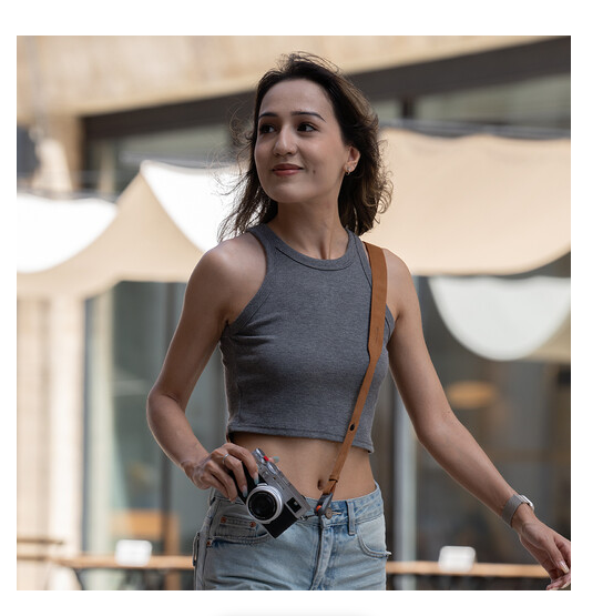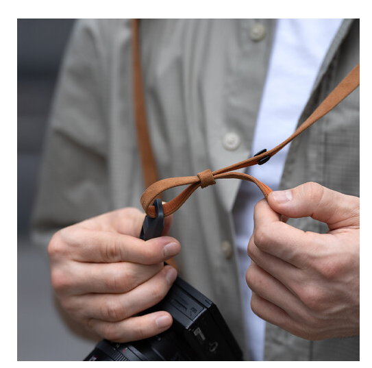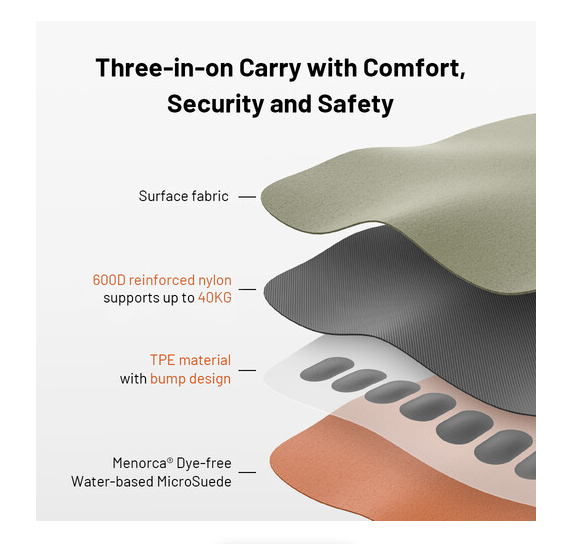 TPE podstava s dizajnom izbočina dodaje udobnost tijekom dulje upotrebe, sprječavajući naprezanje vrata ili ramena. Lagan, samo 70 g, ovaj remen izrađen je od prozračnog ekološki prihvatljivog ojačanog najlona 600D i ima elegantnu završnu obradu u Earth Brown boji. Kombinira sigurnost, praktičnost i estetiku za fotografe u pokretu.
