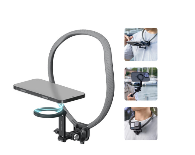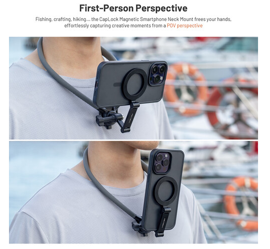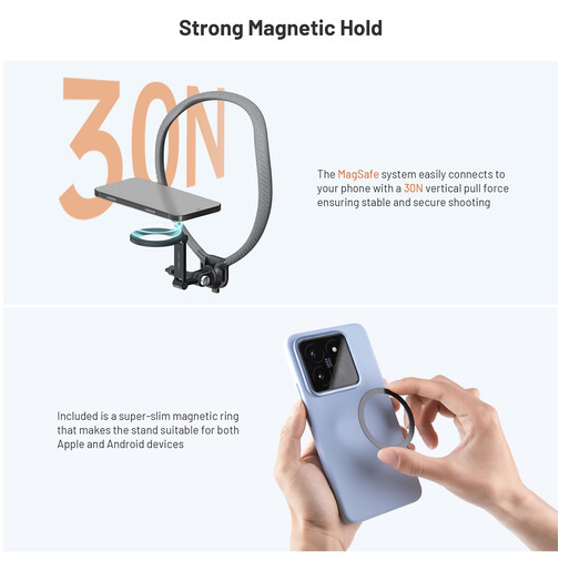 Opremljen magnetskim sustavom za brzo otpuštanje CapLock, držač sigurno drži pametne telefone s MagSafeom ili magnetskim prstenovima za pričvršćivanje te omogućuje brzo pričvršćivanje i uklanjanje. Artikulirani krak čvrsto se zaključava u položaj za precizno okvirenje. Za dodatnu svestranost, uključena je i montaža za akcijsku kameru, što je čini kompatibilnom s kompaktnim kamerama kao što su modeli GoPro i DJI.