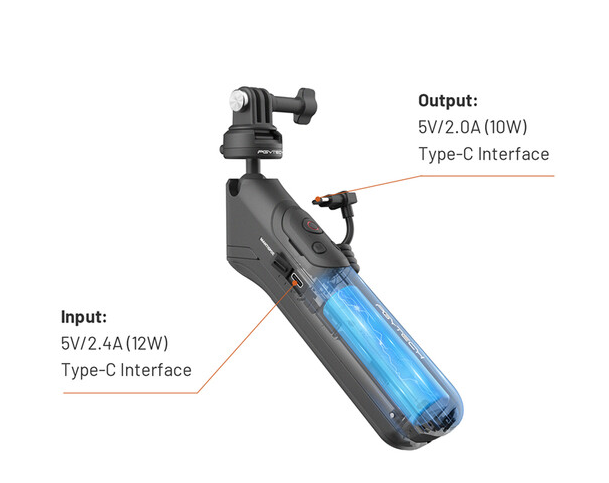 PGYTECH P-GM-149 CapLock MantisPod Power Grip (GoPro Edition) dizajniran je za entuzijaste akcijskih kamera i korisnike pametnih telefona koji žele fleksibilnost, snagu i jednostavnost upotrebe u jednom kompaktnom uređaju. Kompatibilan s GoPro HERO5 do HERO13 i pametnim telefonima s USB-C priključkom (Android, Harmony OS, iOS), ovaj grip omogućuje brigu o snimanju uz istovremeno punjenje zahvaljujući ugrađenoj litij-ionskoj bateriji 21700 (5000 mAh). Baterija podržava brzo punjenje ulazne snage 12 W i izlazne snage 10 W, pružajući otprilike 25 sati rada i potpuno se puni za otprilike sat vremena.