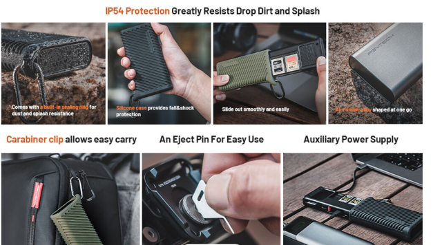 Aluminijska kućišta s IP54 zaštitom, silikonskom zaštitom i brtvenim prstenom štite od padova, prašine i prskanja, dok karabiner omogućuje jednostavno pričvršćivanje na torbe. Pomoćni USB-C priključak za napajanje (5V/2A) osigurava stabilan prijenos podataka. Kompatibilnost plug-and-play omogućuje jednostavno korištenje na uređajima s operativnim sustavima Windows, macOS, Linux, Android i iPadOS, što olakšava prijenos podataka s kamera, dronova ili akcijskih kamera na vaše uređaje. Kompaktan, lagan i vrlo izdržljiv, ovaj kućište za čitač kartica svestrano je rješenje za upravljanje medijima u pokretu.