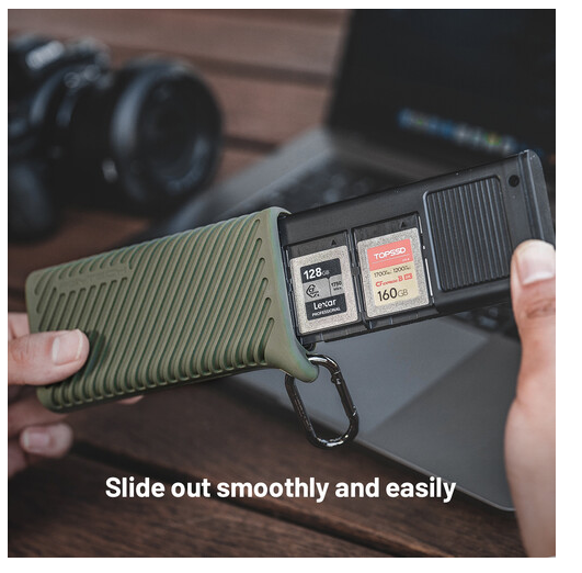 Prijenosite i pohranjujte svoje memorijske kartice u PGYTECH P-GM-168 CreateMate kućištu za čitač kartica CFexpress Type A/SD u boji Moss Green. S ultrabrzim prijenosom podataka do 1000 MB/s, dvostrukim utorima za CFexpress Type A i UHS-II SD kartice, IP54 zaštitom i prostorom za 12 kartica, ovo sve-u-jednom kućište savršeno je za fotografe i videografe u pokretu.